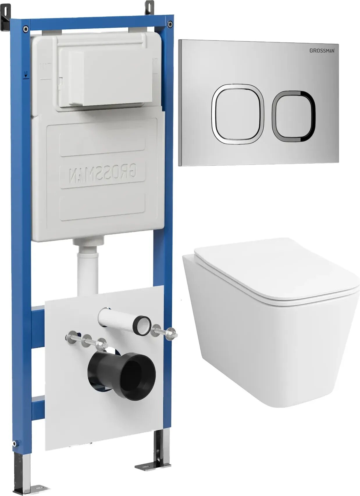 Комплект Унитаз подвесной с инсталляцией Grossman Cosmo 97.4479SQ.02.110 безободковый, белый+ Кнопка смыва хром матовый