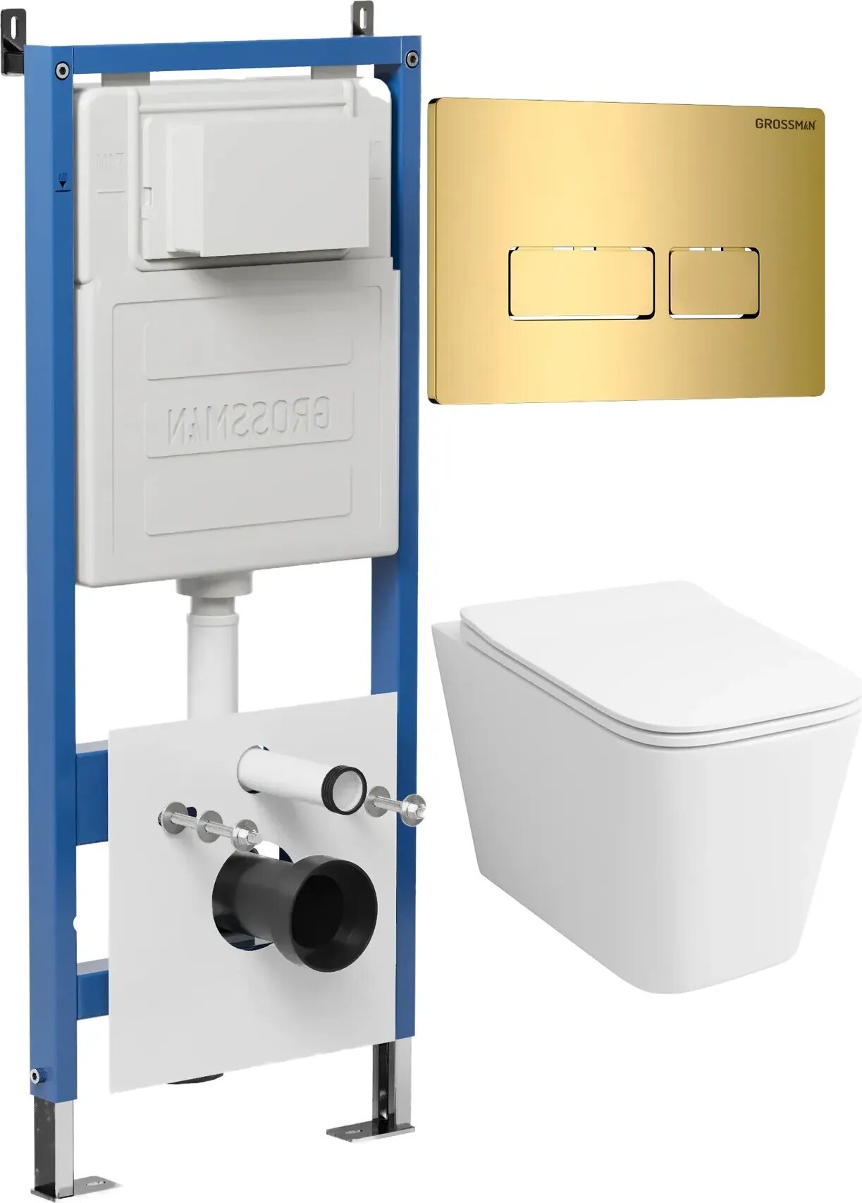 Комплект Унитаз подвесной с инсталляцией Grossman Pragma 97.4479SQ.03.300 безободковый, белый+ Кнопка смыва золото глянцевое