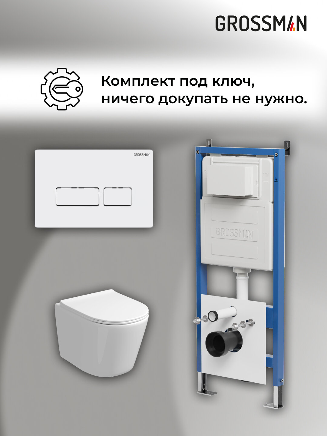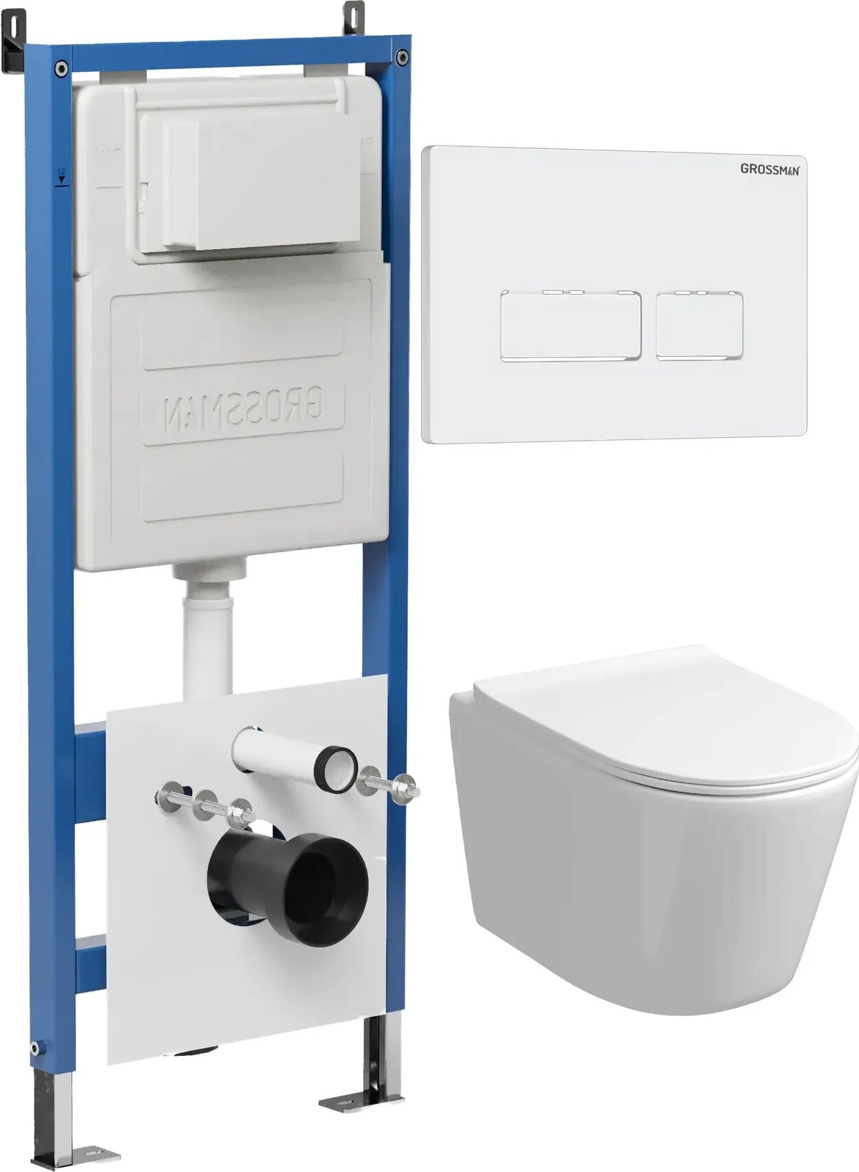 Комплект Унитаз подвесной с инсталляцией Grossman Pragma 97.4477SQ.03.000 безободковый, белый+ Кнопка смыва белая