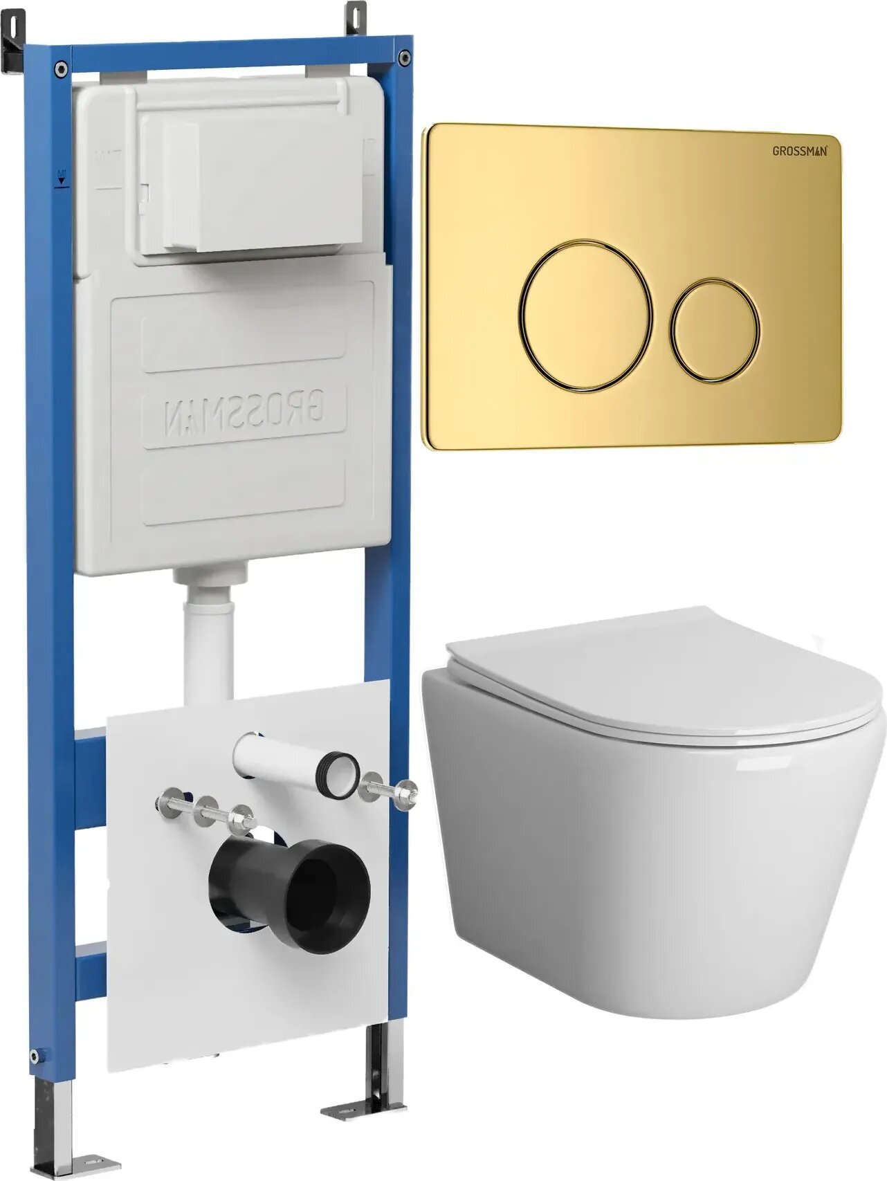 Комплект Унитаз подвесной с инсталляцией Grossman Style 97.4478SQ.05.30M безободковый, белый+ Кнопка смыва золото глянцевое