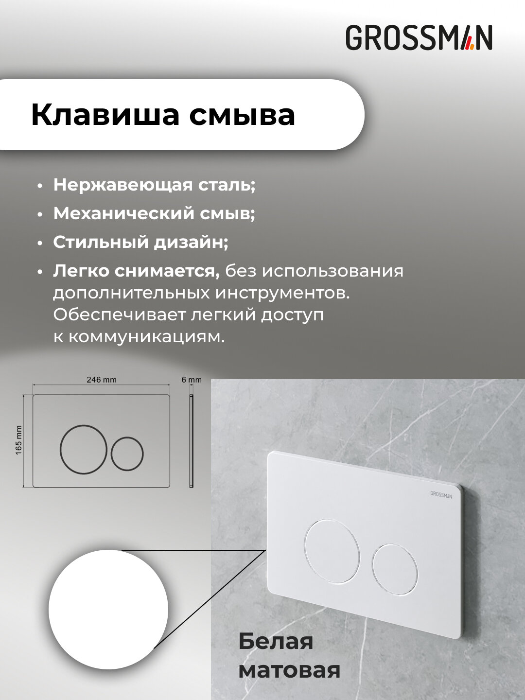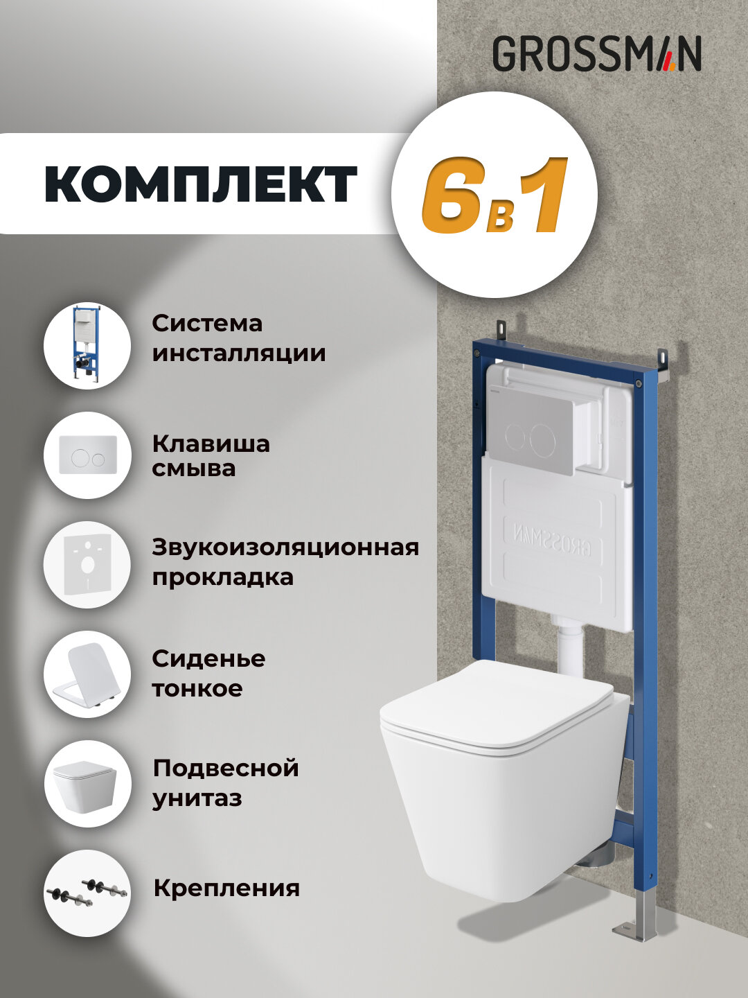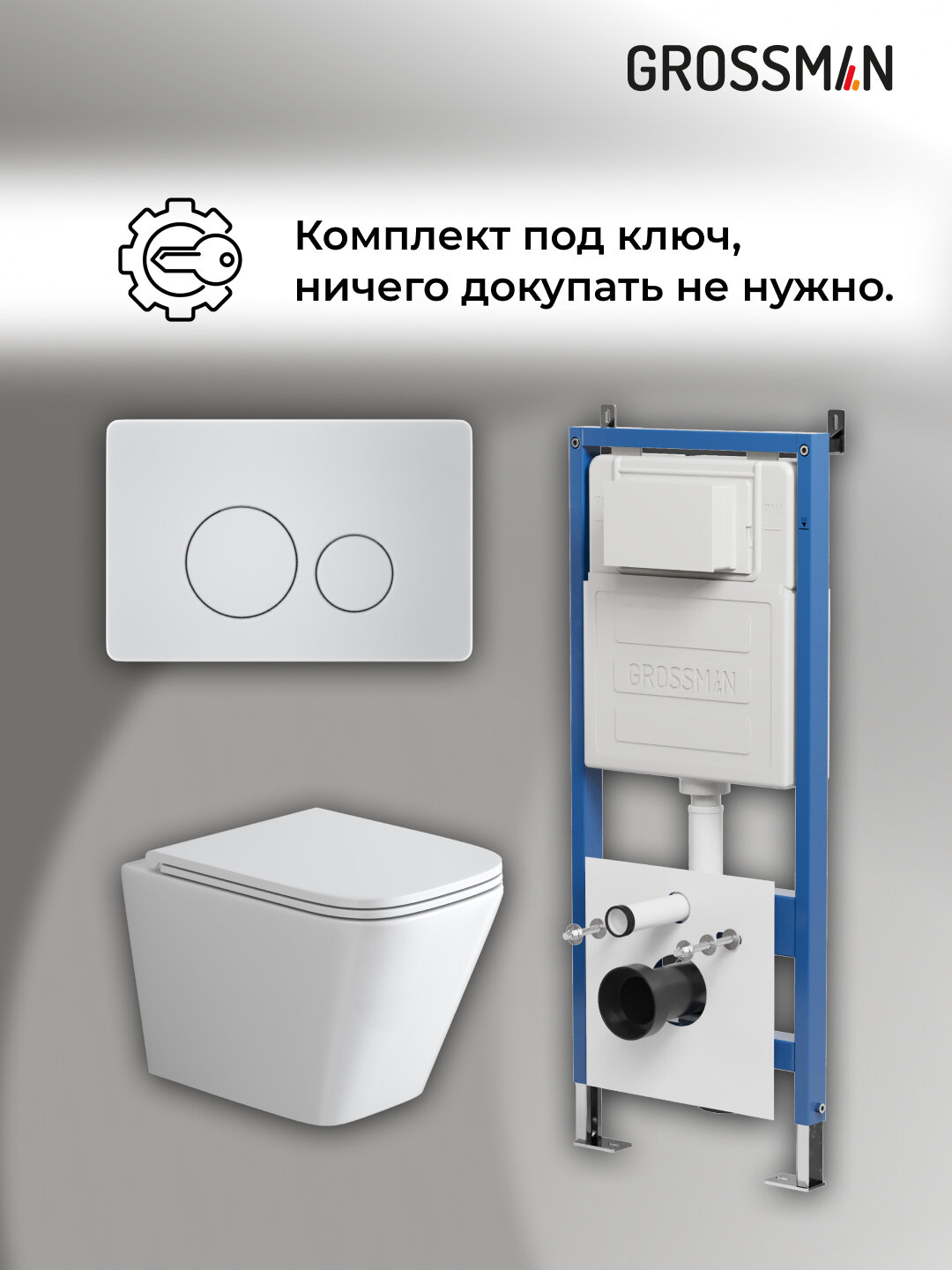 Комплект Унитаз подвесной с инсталляцией Grossman Style 97.4479SQ.05.01M безободковый, белый+ Кнопка смыва белая матовая