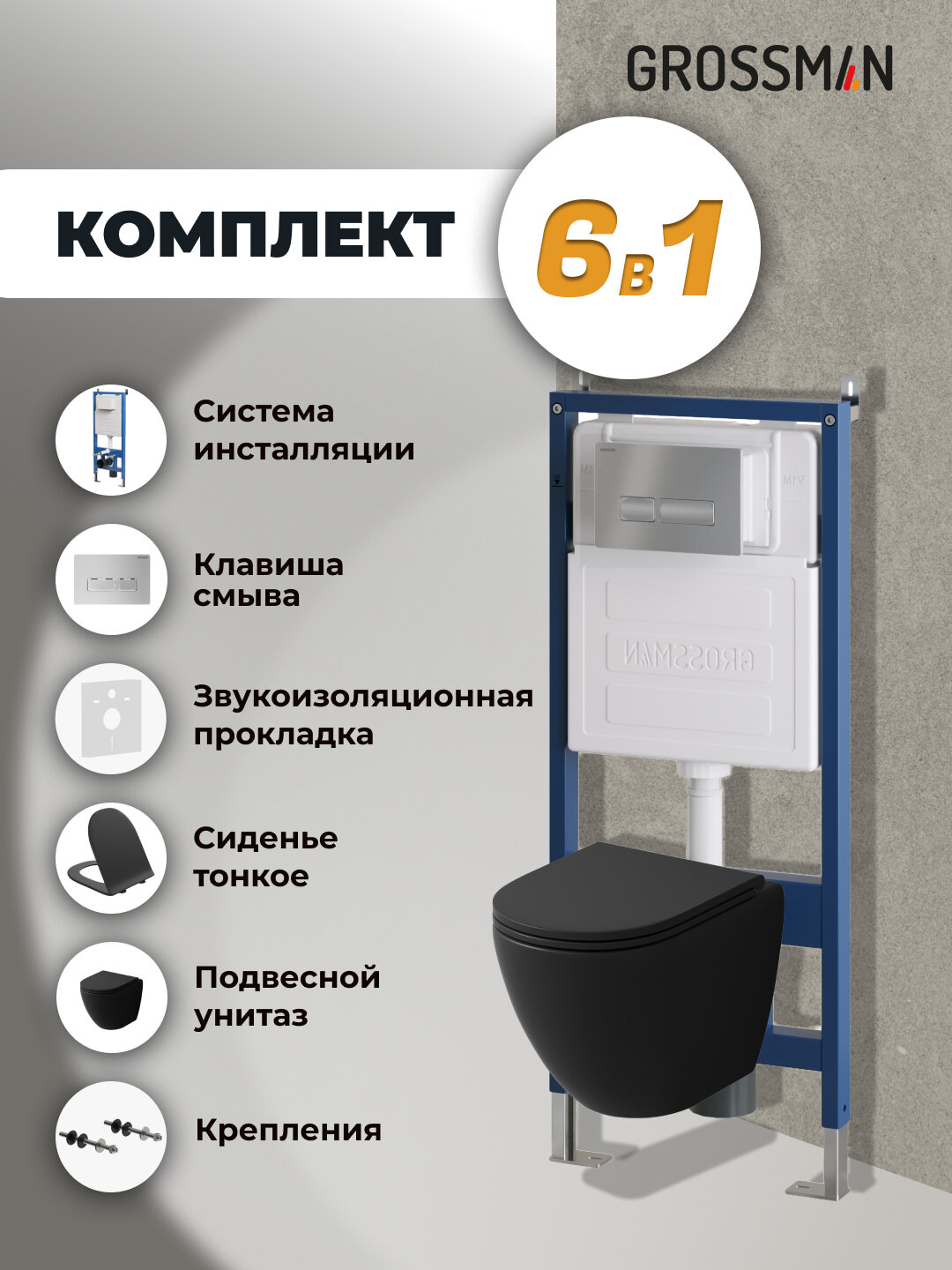 Комплект Унитаз подвесной с инсталляцией Grossman Pragma 97.4455BMS.03.110 безободковый, черный матовый+ Кнопка смыва хром матовый
