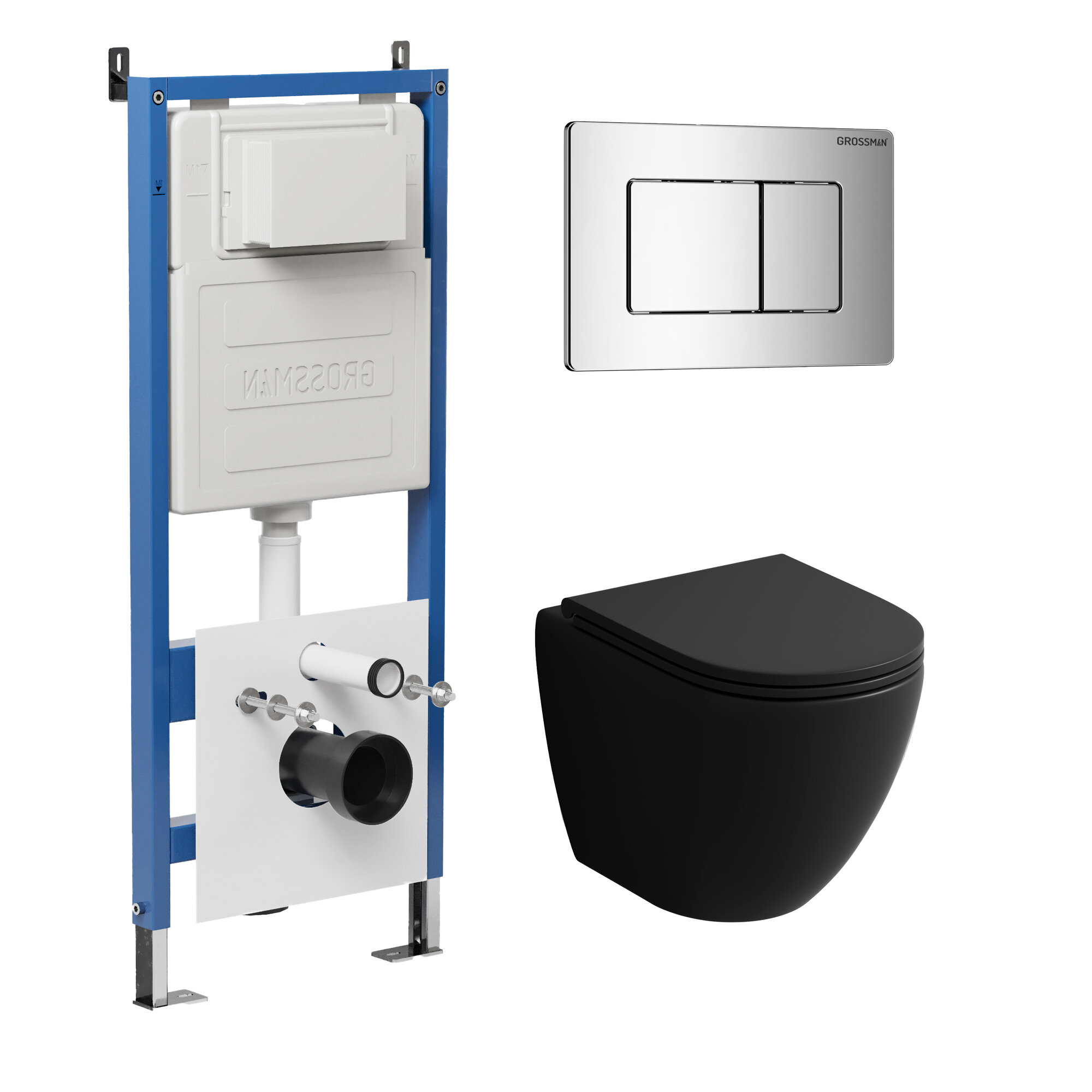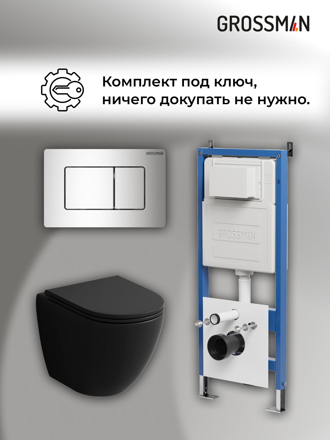 Комплект Унитаз подвесной с инсталляцией Grossman Classic 97.4455BMS.04.10M безободковый, черный матовый+ Кнопка смыва хром глянцевый