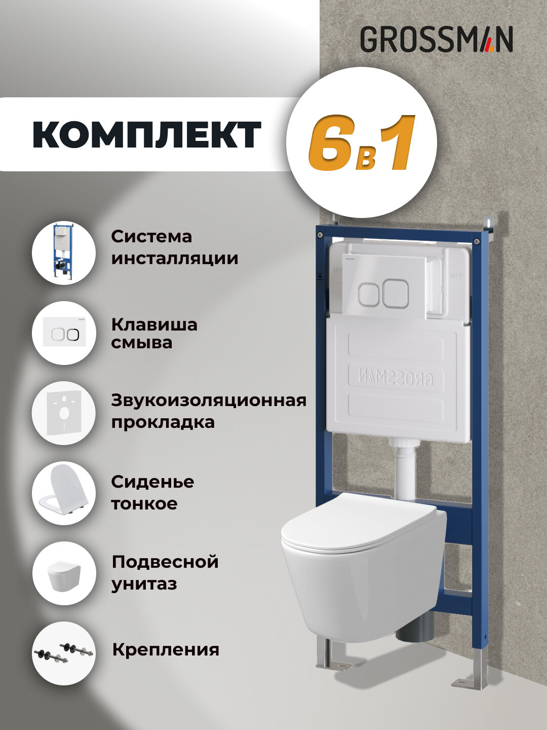Комплект Унитаз подвесной с инсталляцией Grossman Cosmo 97.4477SQ.02.000 безободковый, белый+ Кнопка смыва белая