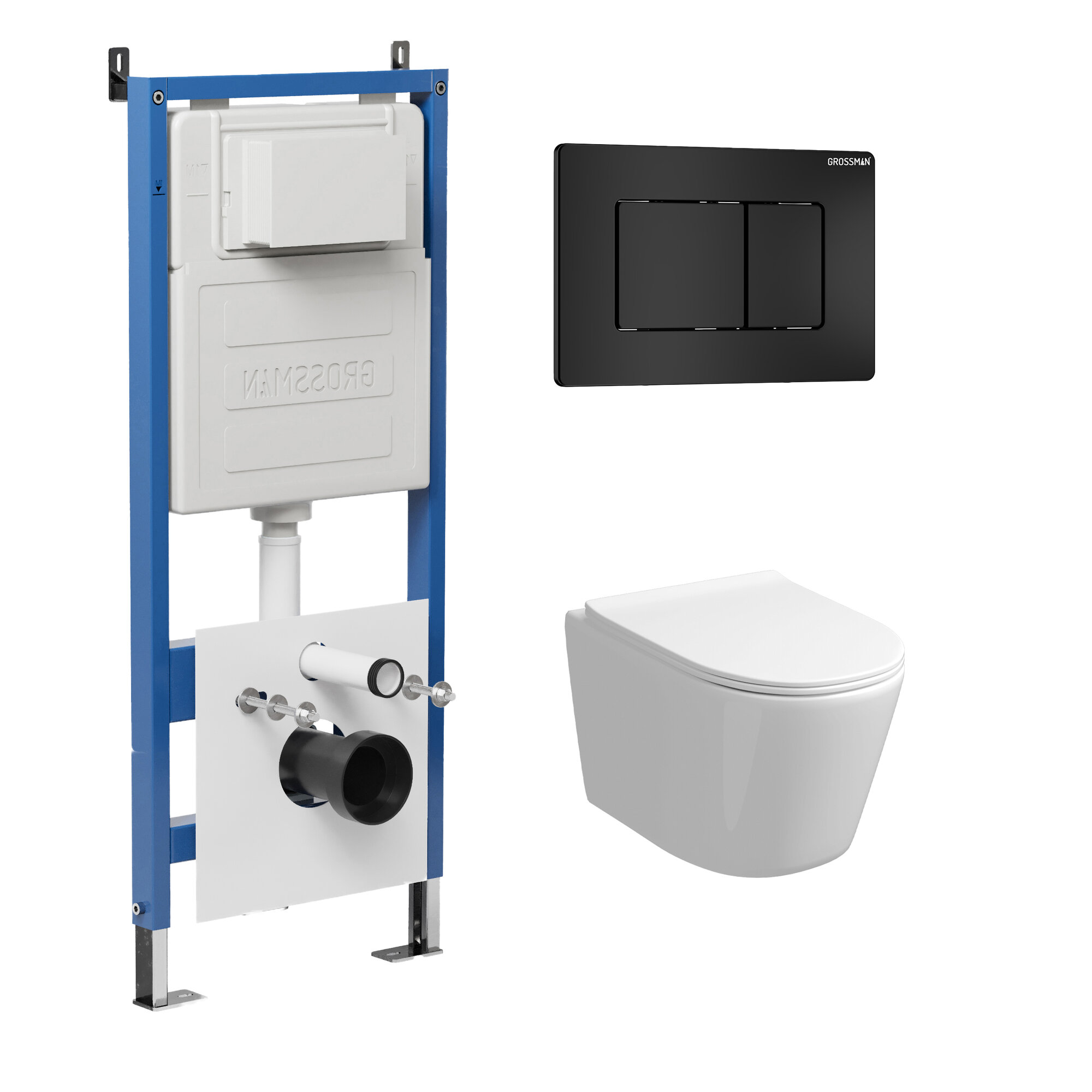 Комплект Унитаз подвесной с инсталляцией Grossman Classic 97.4477SQ.04.21M безободковый, белый+ Кнопка смыва черная матовая