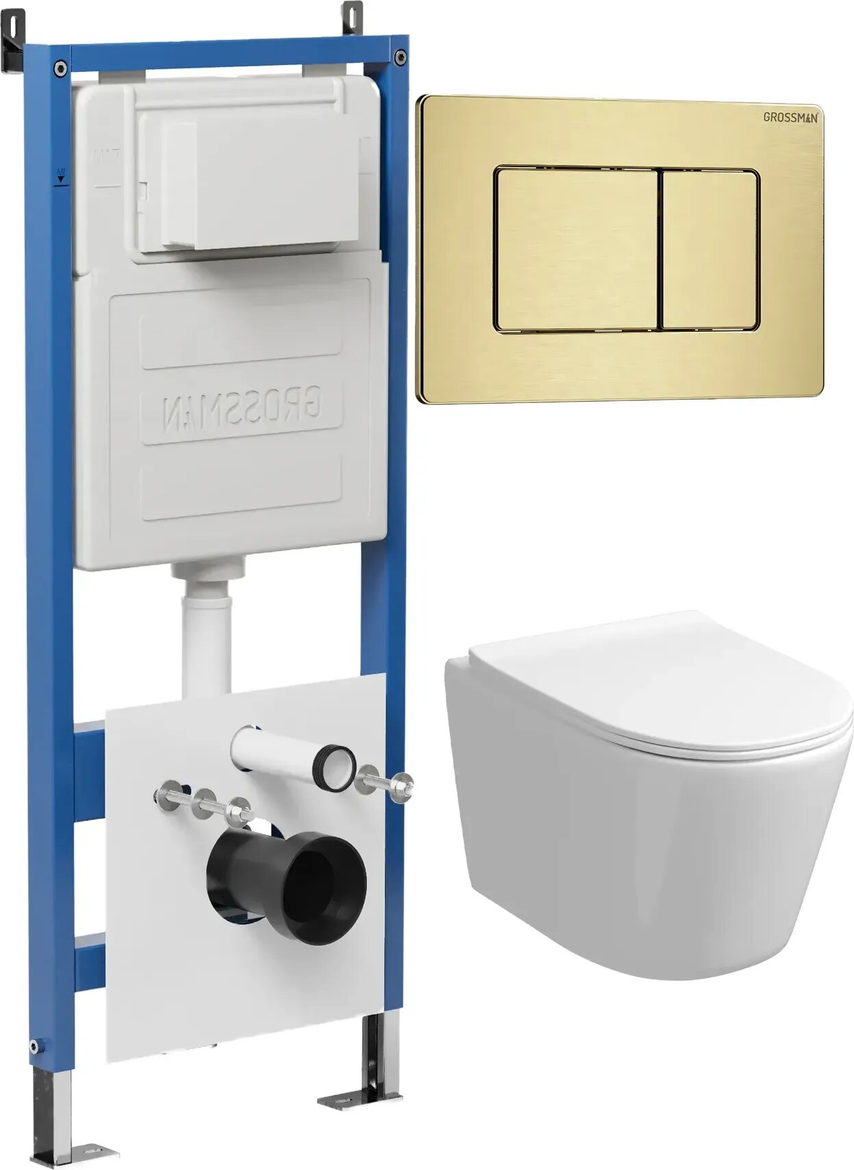 Комплект Унитаз подвесной с инсталляцией Grossman Classic 97.4477SQ.04.32M безободковый, белый+ Кнопка смыва золото сатиновое