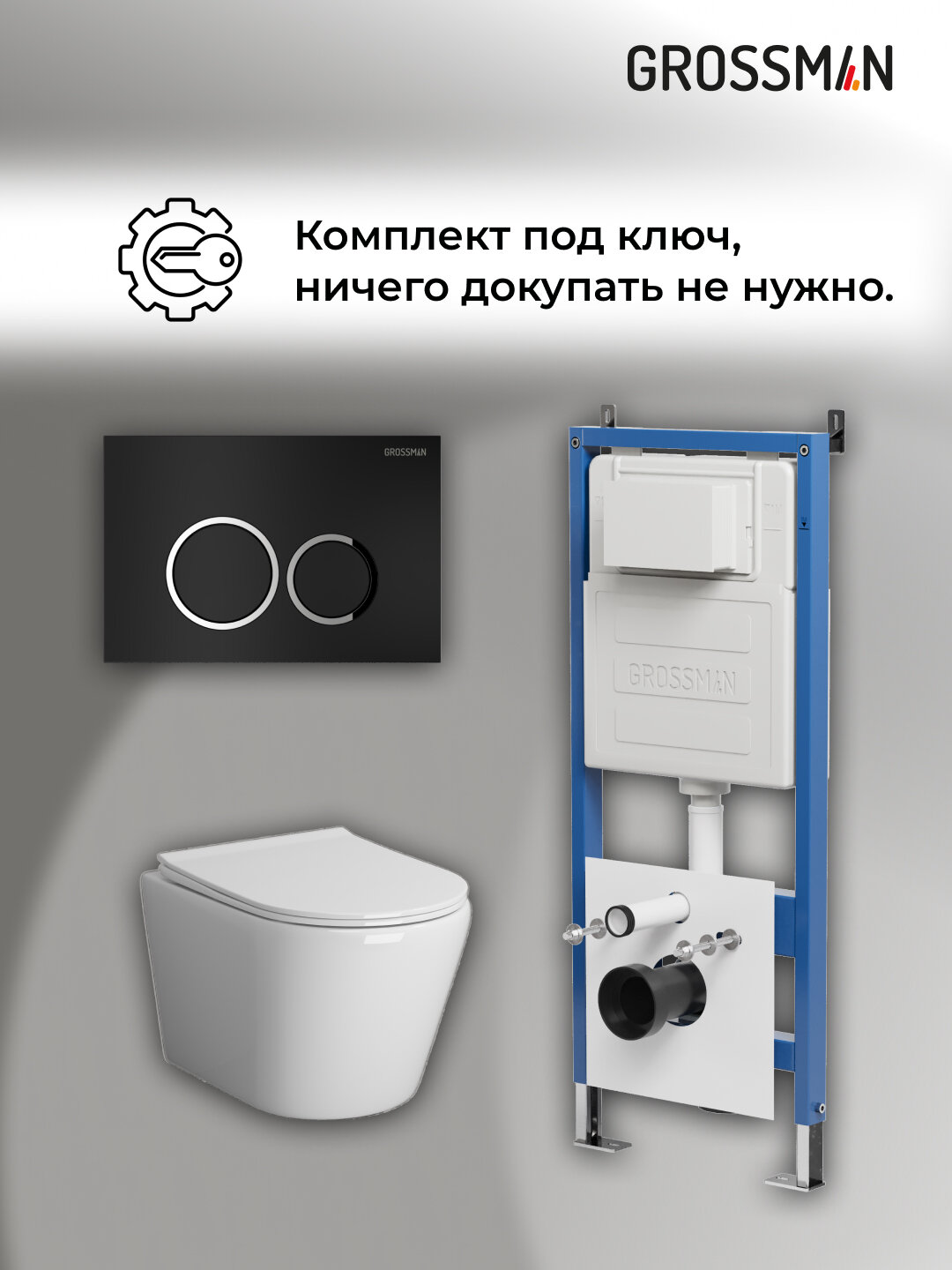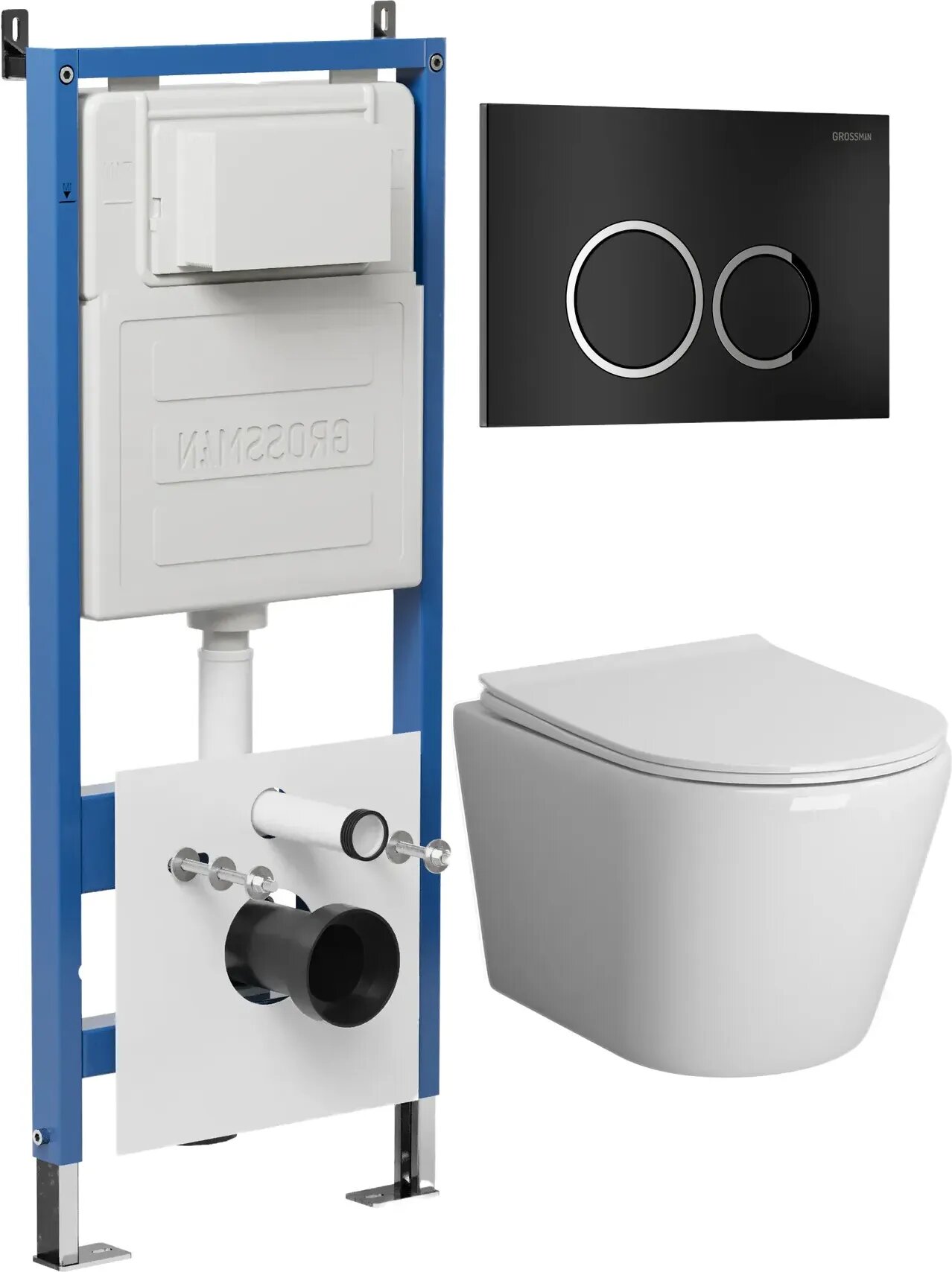 Комплект Унитаз подвесной с инсталляцией Grossman Galaxy 97.4478SQ.01.210 безободковый, белый+ Кнопка смыва черная матовая