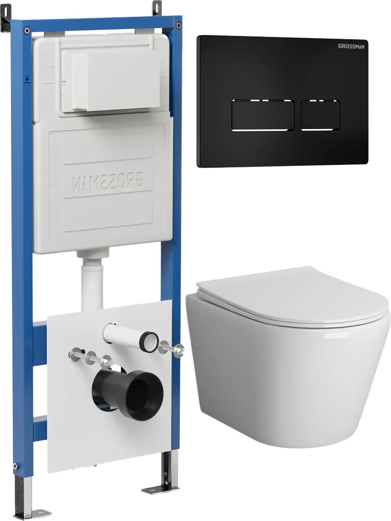 Комплект Унитаз подвесной с инсталляцией Grossman Pragma 97.4478SQ.03.210 безободковый, белый+ Кнопка смыва черная матовая