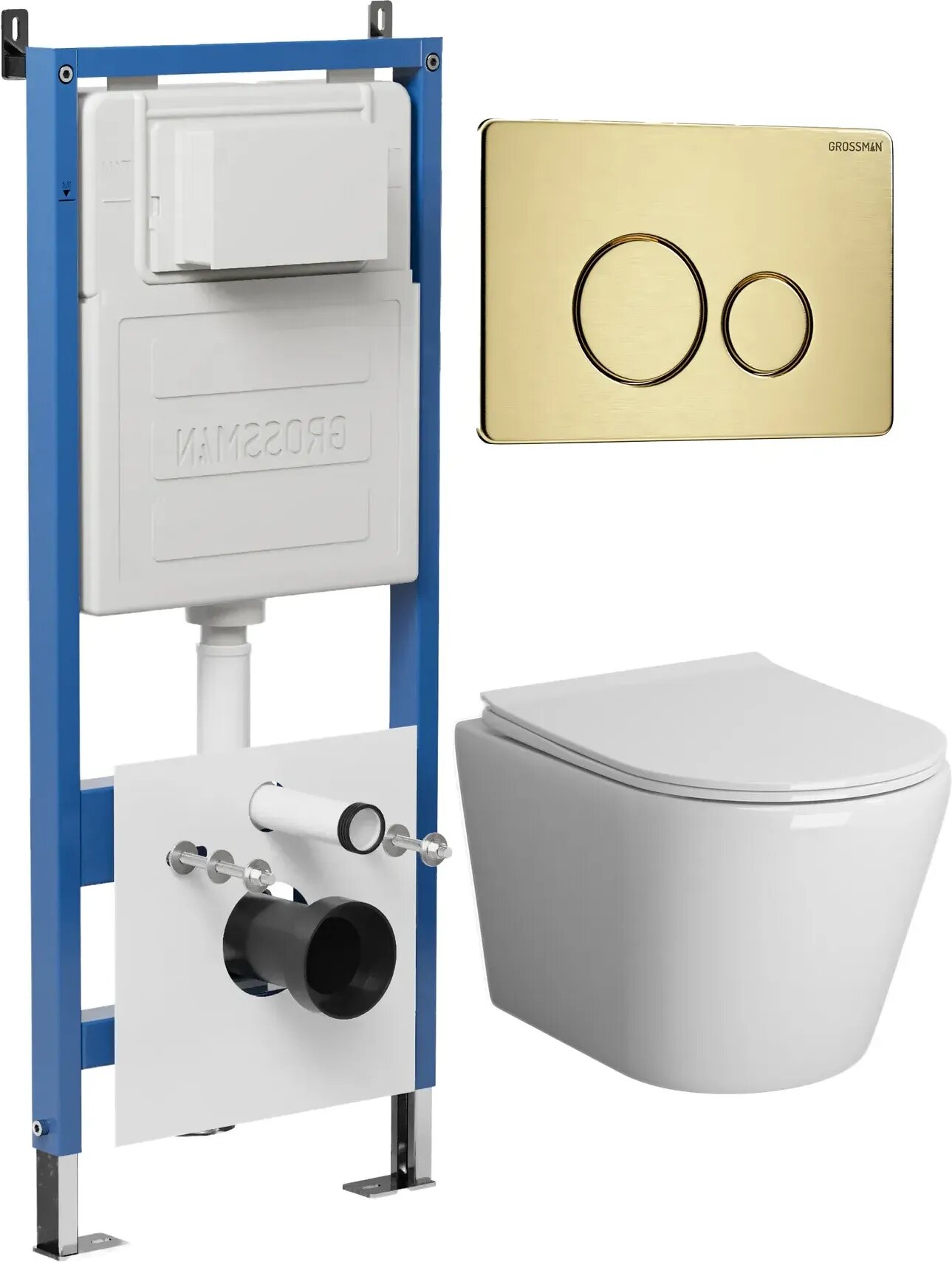 Комплект Унитаз подвесной с инсталляцией Grossman Style 97.4478SQ.05.32M безободковый, белый+ Кнопка смыва золото сатиновое