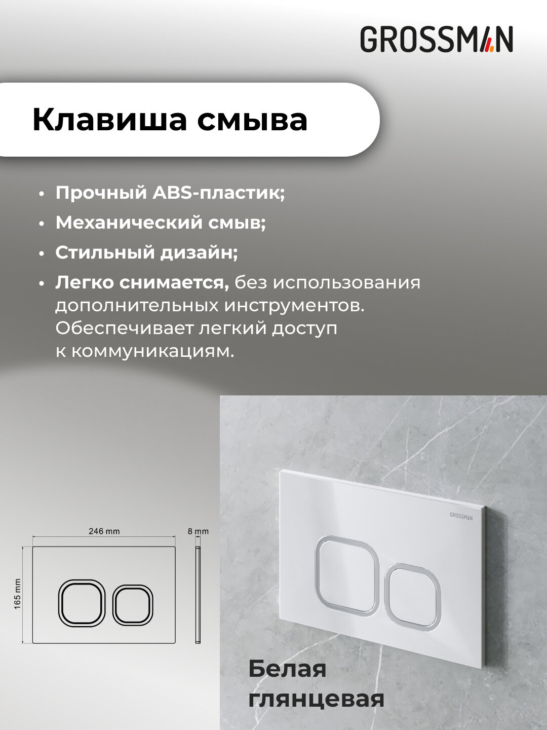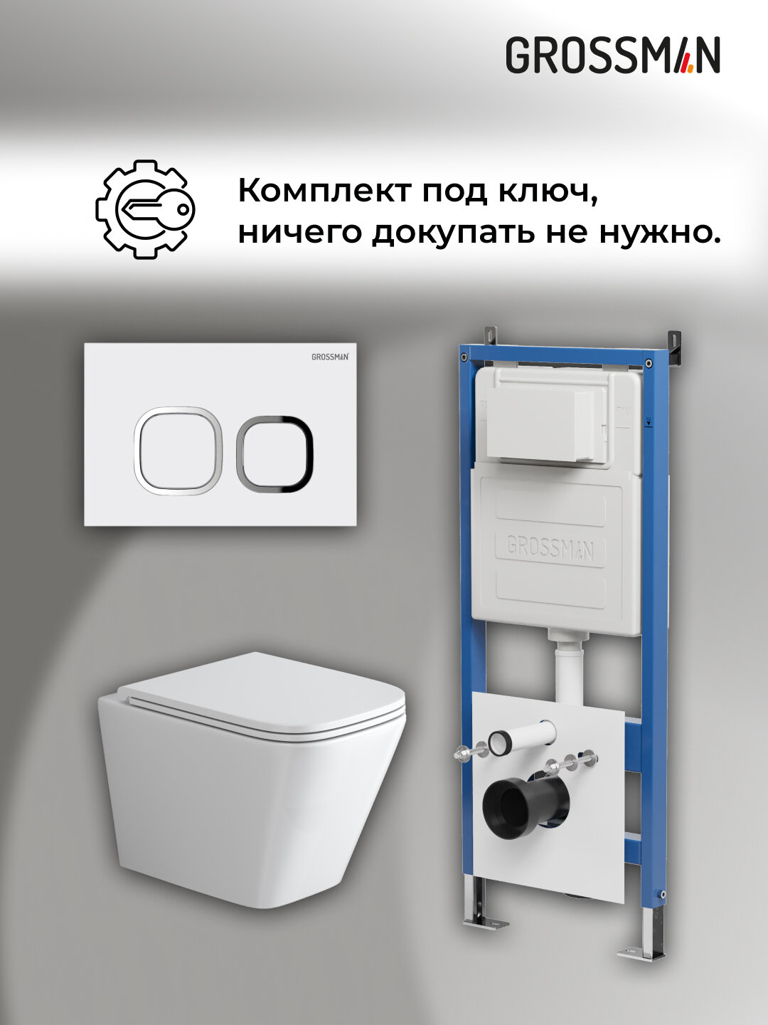 Комплект Унитаз подвесной с инсталляцией Grossman Cosmo 97.4479SQ.02.000 безободковый, белый+ Кнопка смыва белая