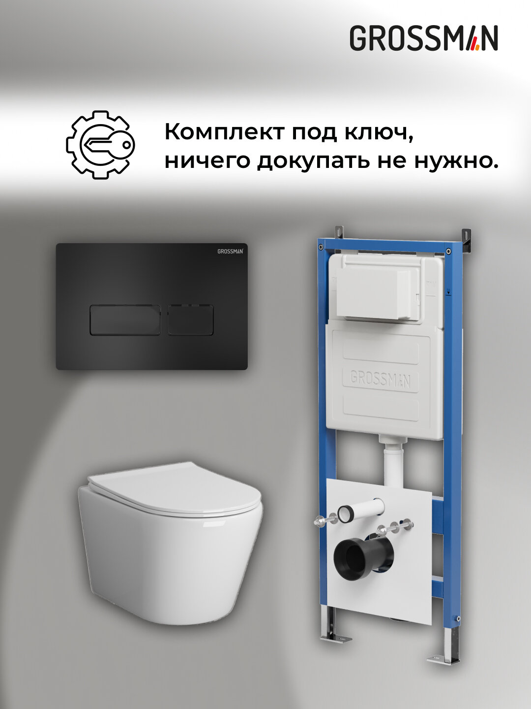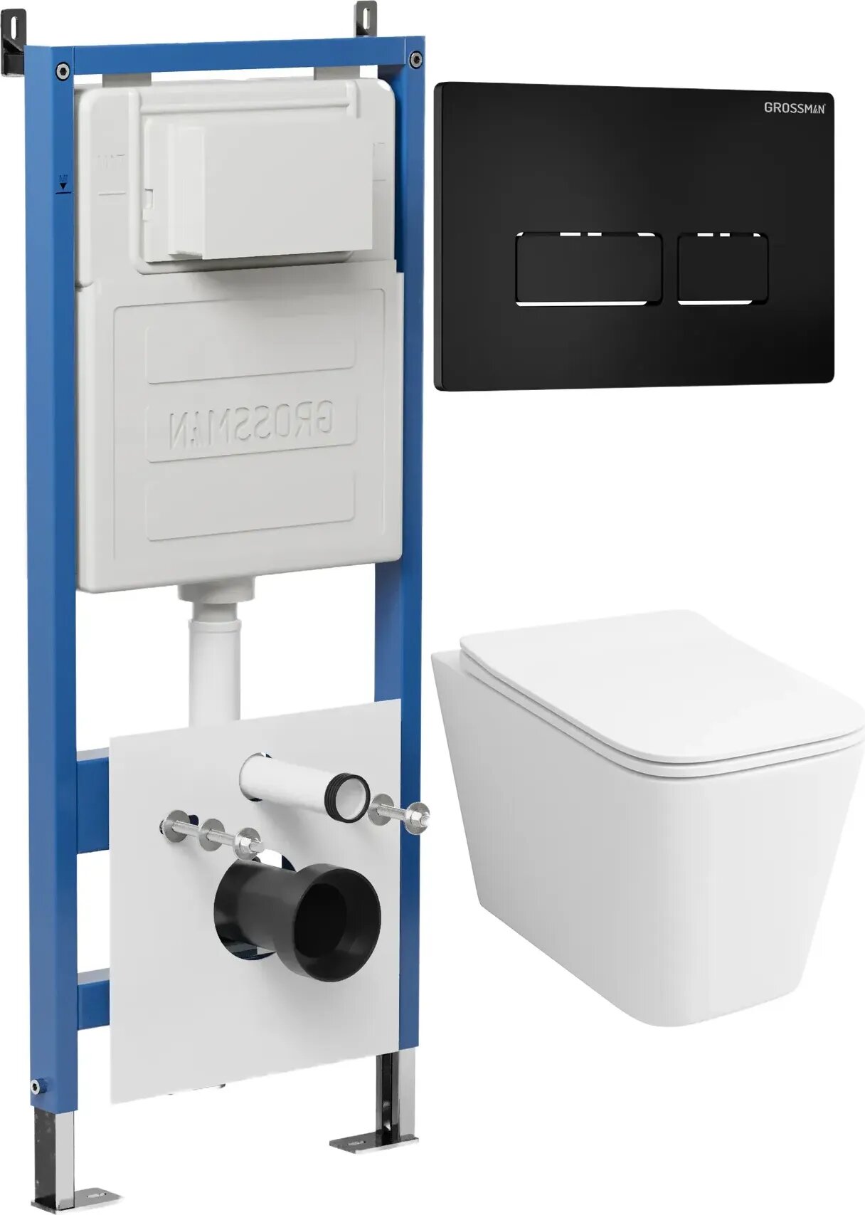 Комплект Унитаз подвесной с инсталляцией Grossman Pragma 97.4479SQ.03.210 безободковый, белый+ Кнопка смыва черная матовая