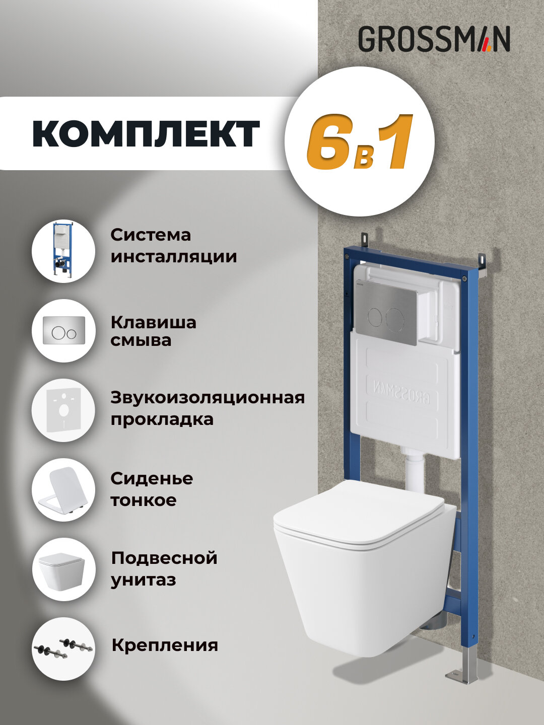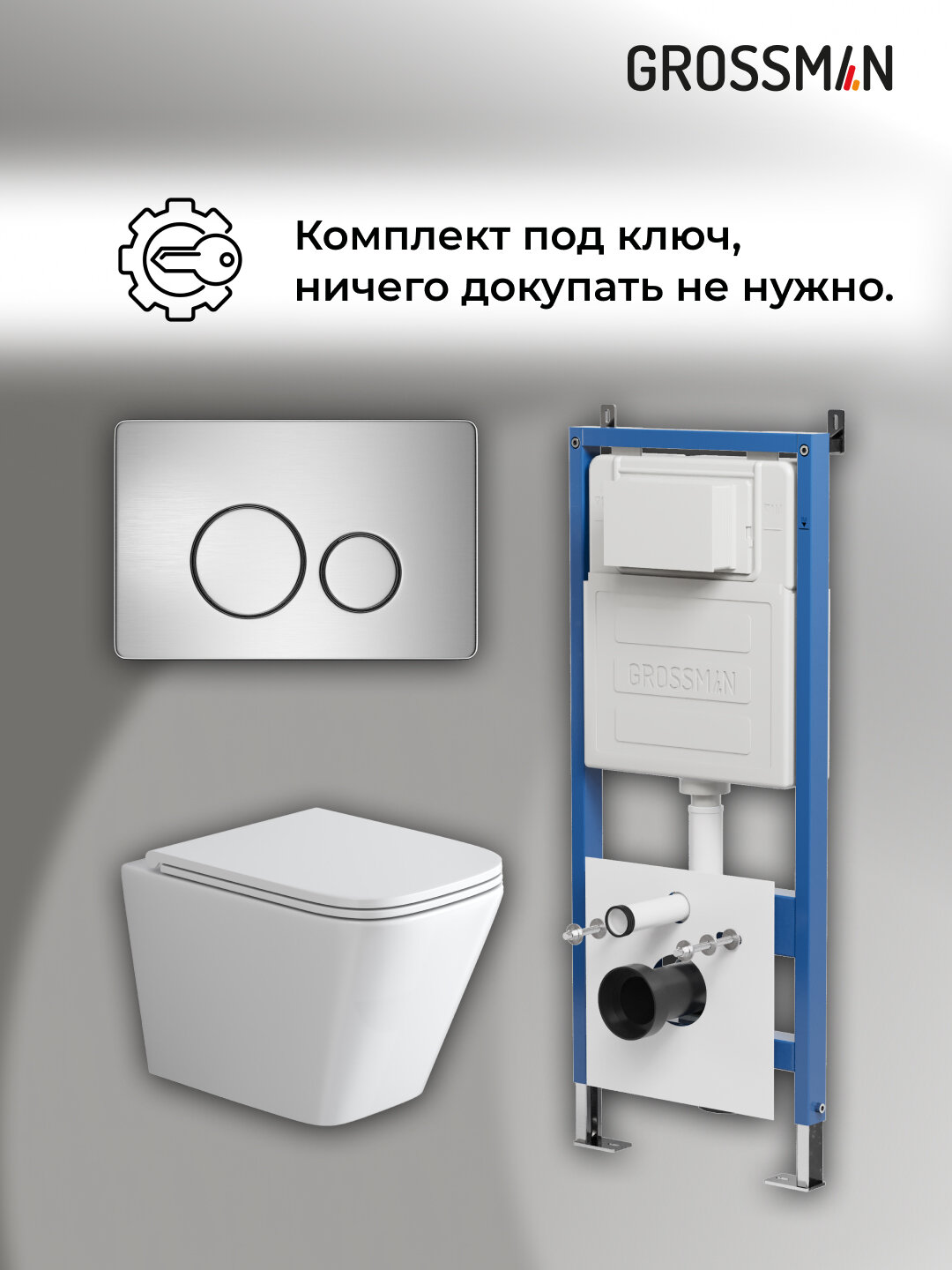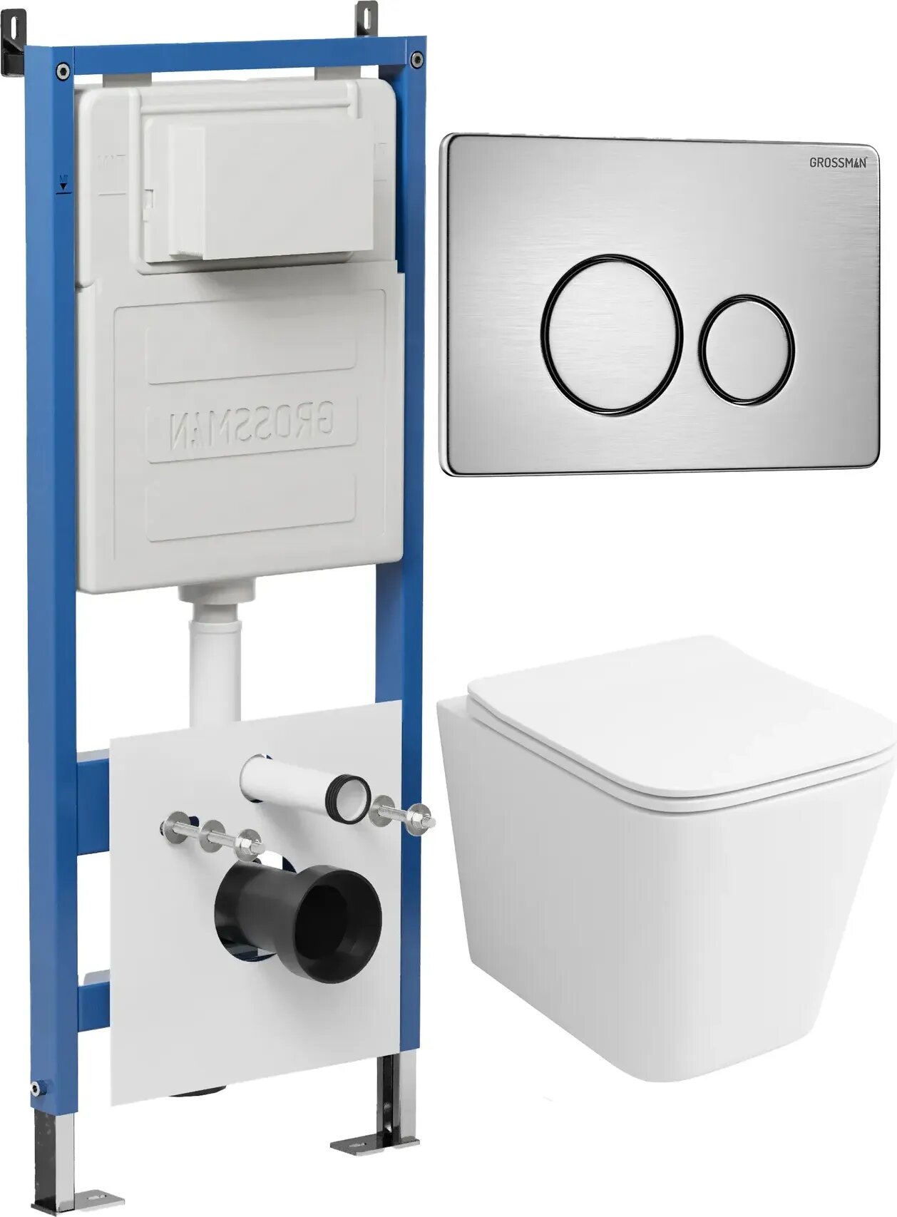 Комплект Унитаз подвесной с инсталляцией Grossman Style 97.4479SQ.05.12M безободковый, белый+ Кнопка смыва хром сатиновый