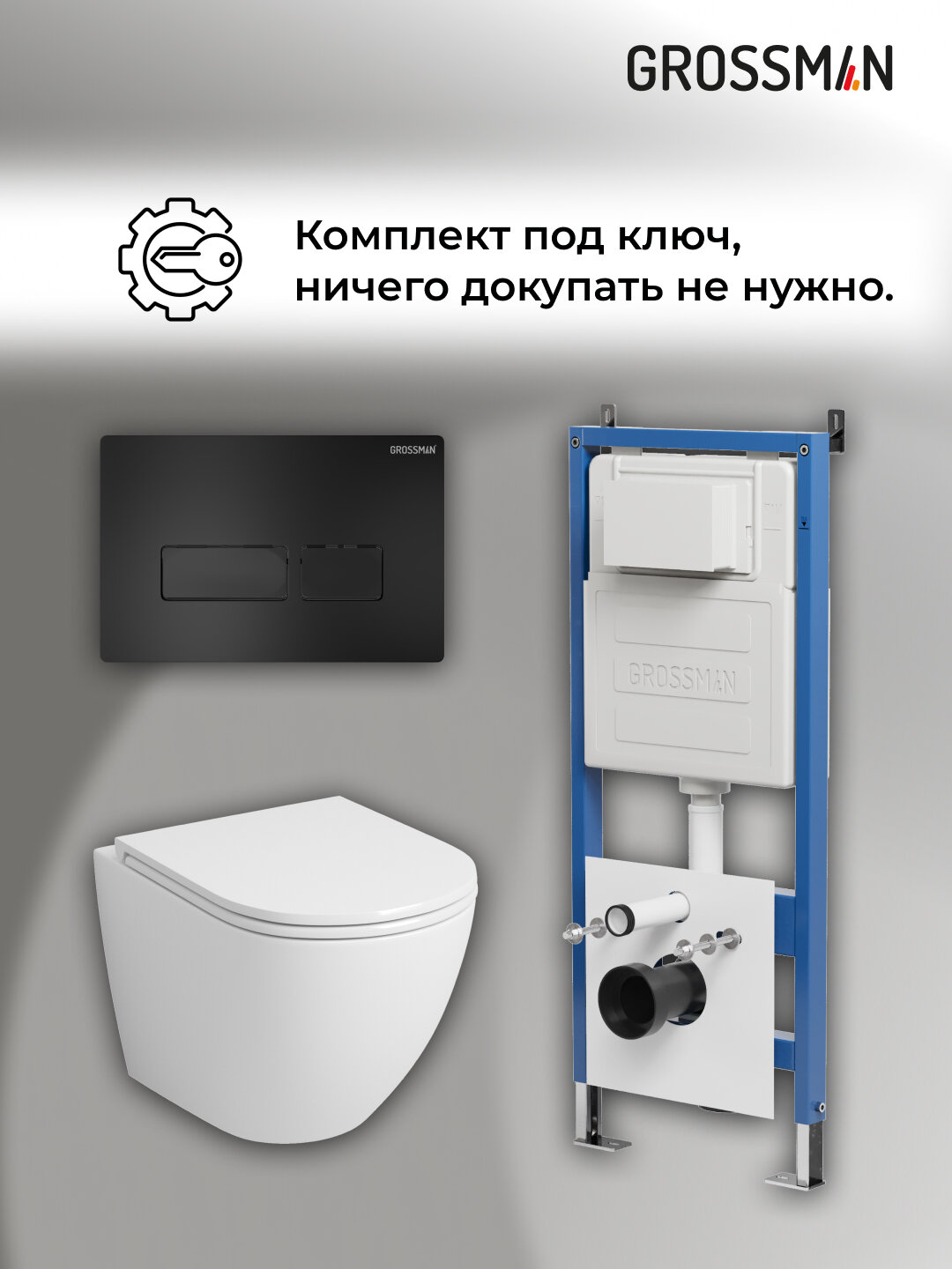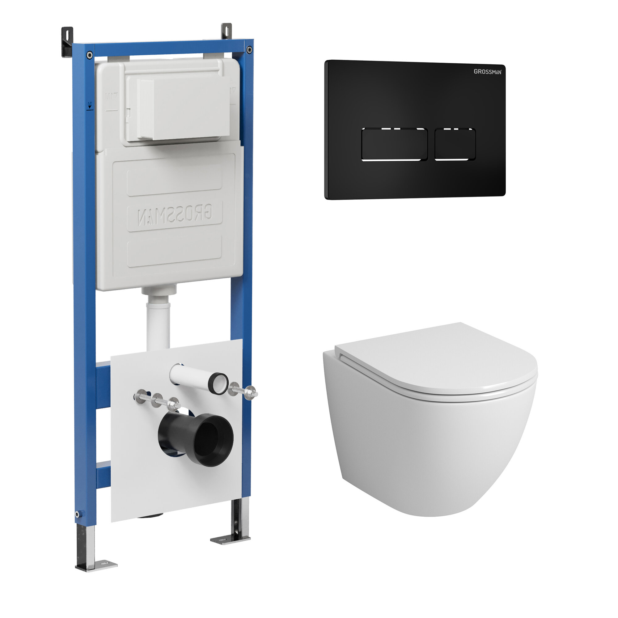 Комплект Унитаз подвесной с инсталляцией Grossman Pragma 97.4455SQ.03.210 безободковый, белый+ Кнопка смыва черная матовая