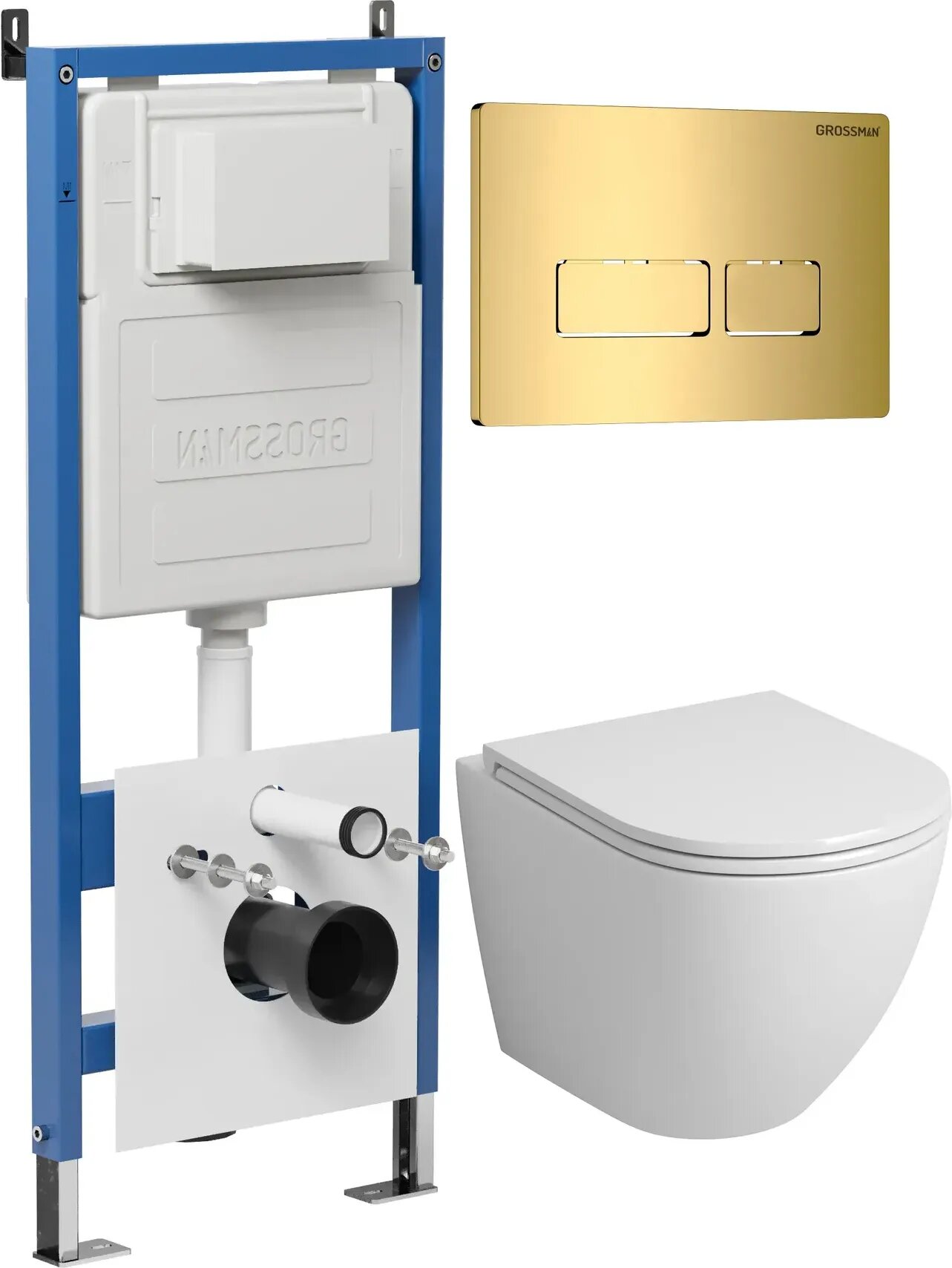 Комплект Унитаз подвесной с инсталляцией Grossman Pragma 97.4455SQ.03.300 безободковый, белый+ Кнопка смыва золото глянцевое