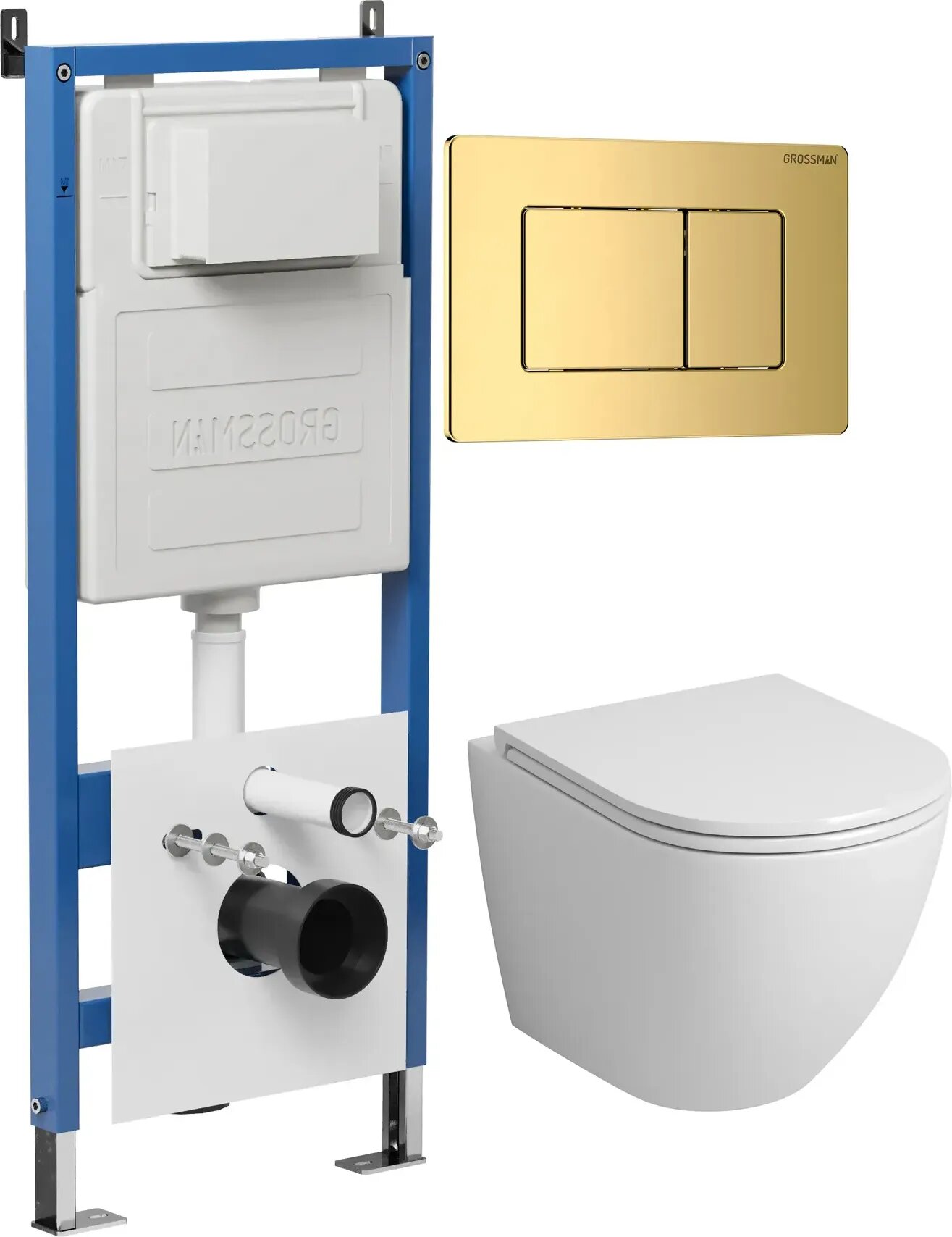 Комплект Унитаз подвесной с инсталляцией Grossman Classic 97.4455SQ.04.30M безободковый, белый+ Кнопка смыва золото глянцевое