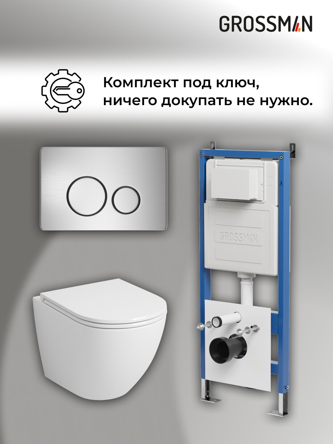 Комплект Унитаз подвесной с инсталляцией Grossman Style 97.4455SQ.05.12M безободковый, белый+ Кнопка смыва хром сатиновый