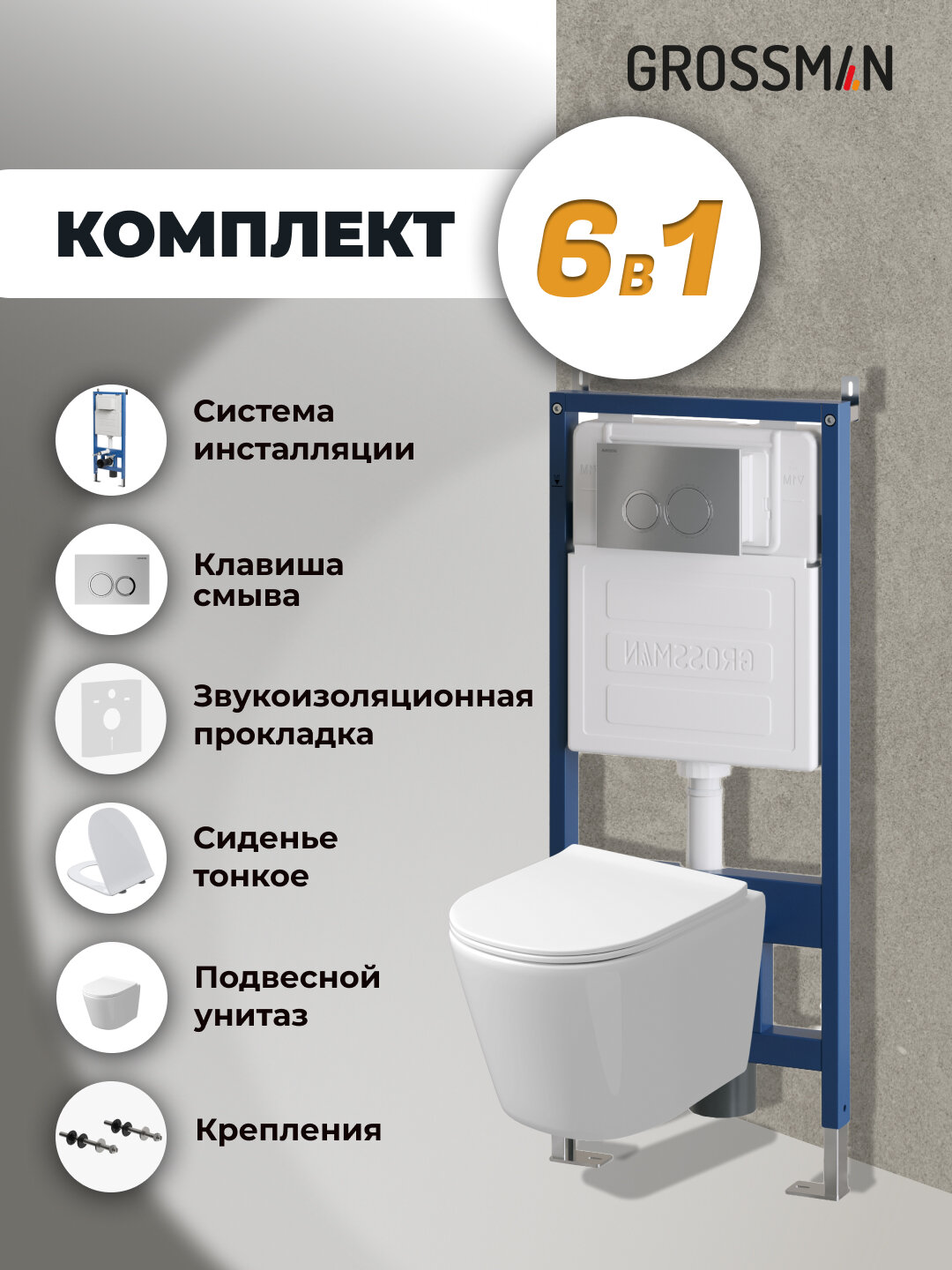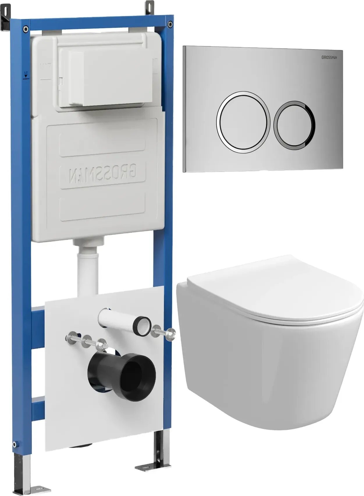 Комплект Унитаз подвесной с инсталляцией Grossman Galaxy 97.4477SQ.01.110 безободковый, белый+ Кнопка смыва хром матовый