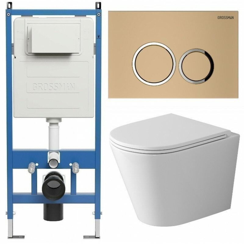 Комплект Унитаз подвесной с инсталляцией Grossman Galaxy 97.4478SQ.01.310 безободковый, белый+ Кнопка смыва золото матовое