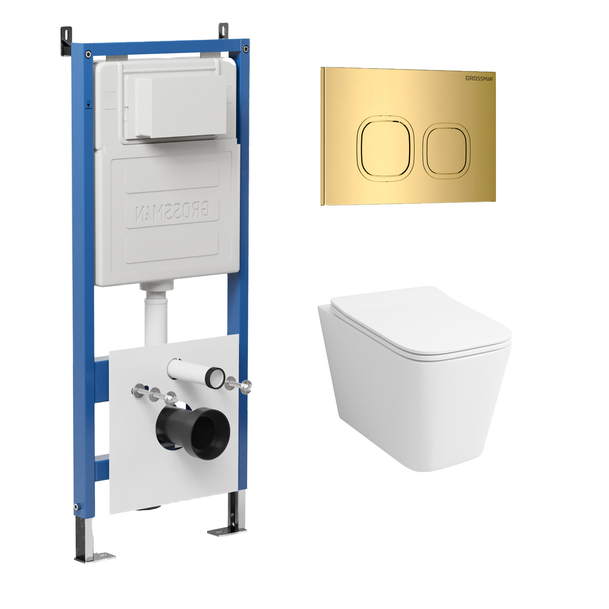 Комплект Унитаз подвесной с инсталляцией Grossman Cosmo 97.4479SQ.02.300 безободковый, белый+ Кнопка смыва золото глянцевое