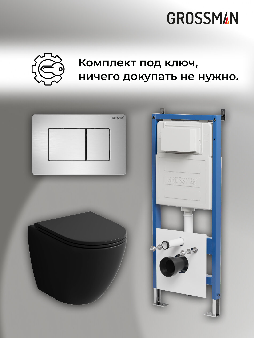 Комплект Унитаз подвесной с инсталляцией Grossman Classic 97.4455BMS.04.12M безободковый, черный матовый+ Кнопка смыва хром сатиновый