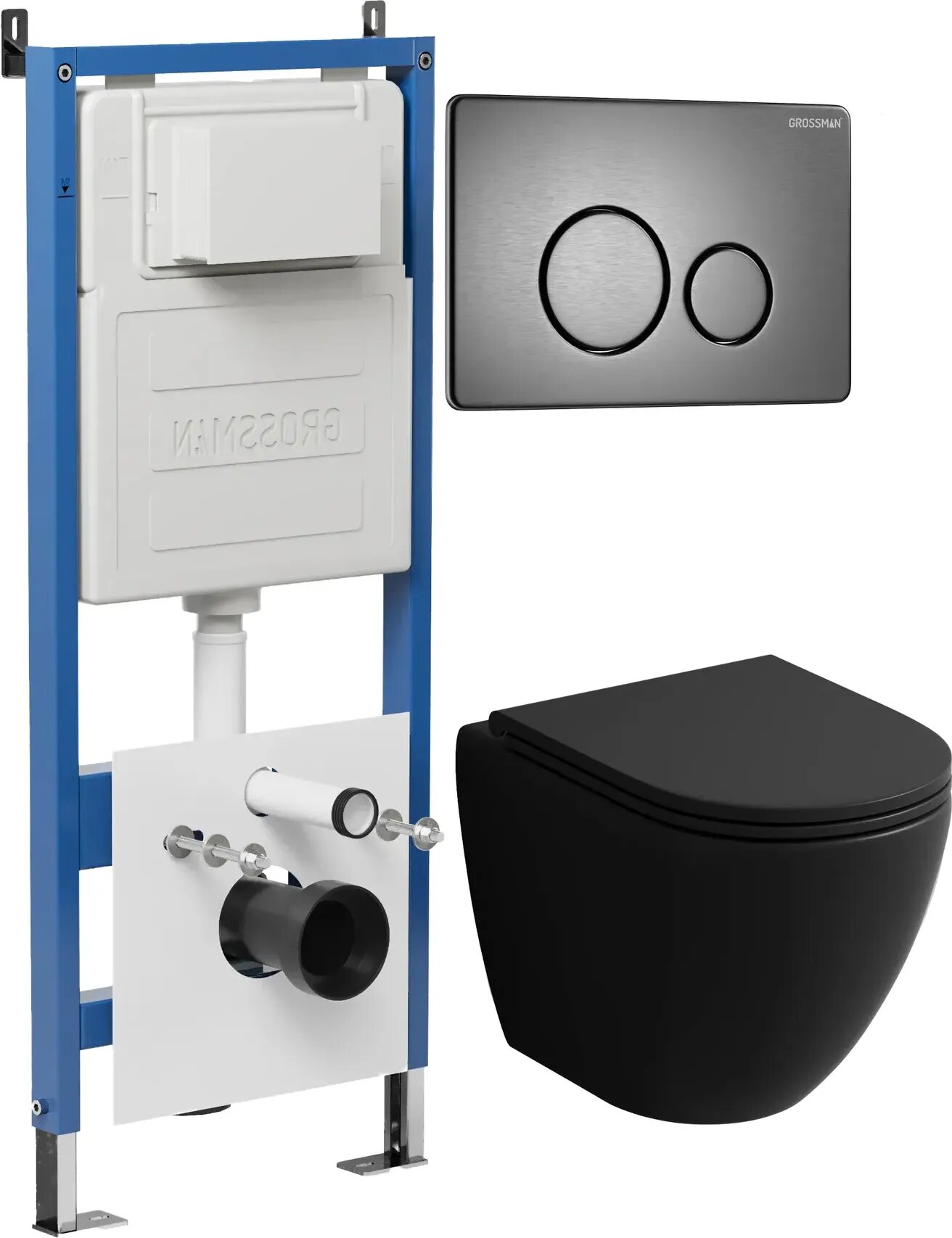 Комплект Унитаз подвесной с инсталляцией Grossman Style 97.4455BMS.05.42M безободковый, черный матовый+ Кнопка смыва графит сатиновый