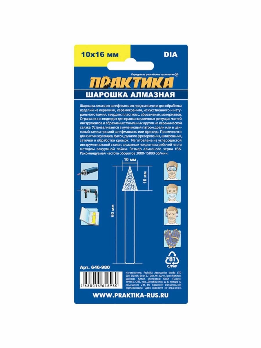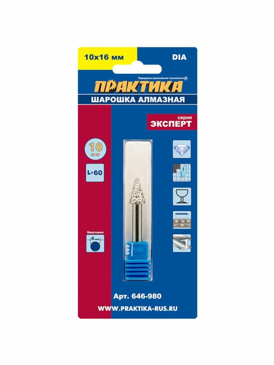 Описание: Шарошка алмазная коническая Практика - входит в серию "Эксперт" и предназначена для точной и качественной обработки изделий из керамогранита, искусственного и натурального камня, керамики, абразивных пластиков, инструментальных, тугоплавких и высокопрочных сталей. Подходит для прямых шлифовальных машин с цанговым зажимом и дрели с кулачковым патроном. Применяется для снятия заусенцев, фасок, шлифования, заточки, обработки кромок.