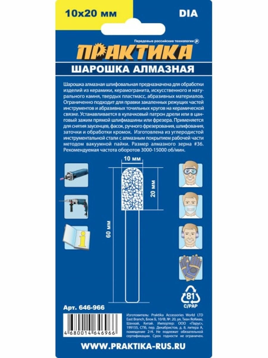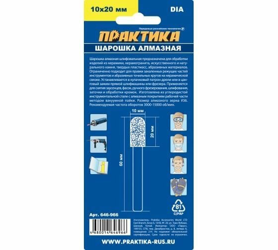 Шарошка алмазная шлифовальная предназначена для обработки изделий из керамогранита, искусственного и натурального камня, керамики, абразивных пластиков, инструментальных, тугоплавких и высокопрочных сталей с помощью прямой шлифовальной машины с цанговым зажимом или дрели с кулачковым патроном. Основное назначение – снятие заусенцев, фасок, шлифование, заточка, обработка кромок. Алмазное зерно #36.