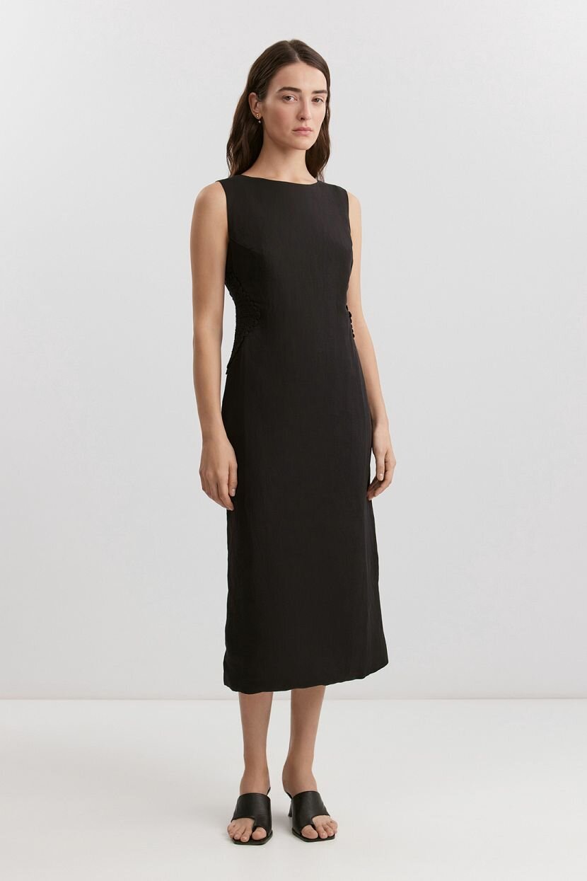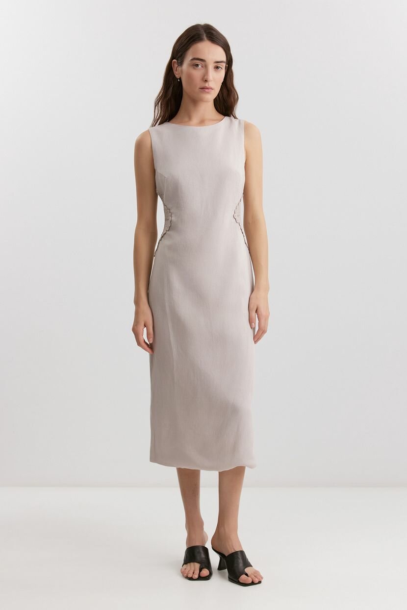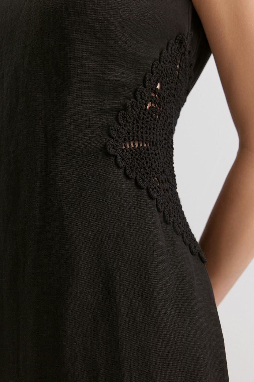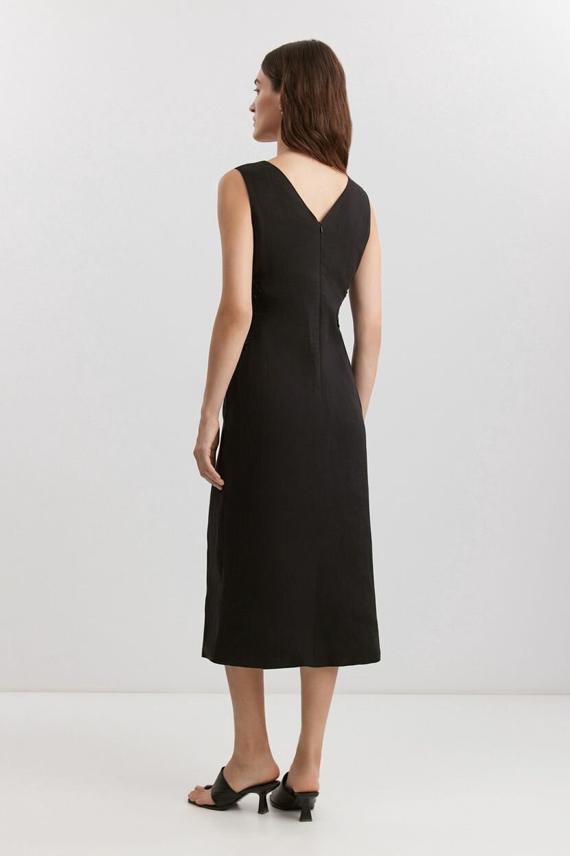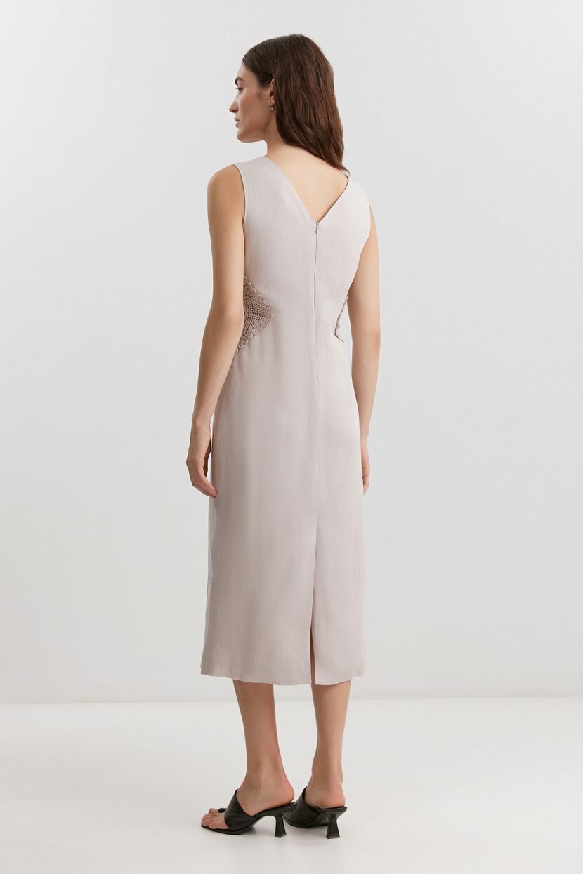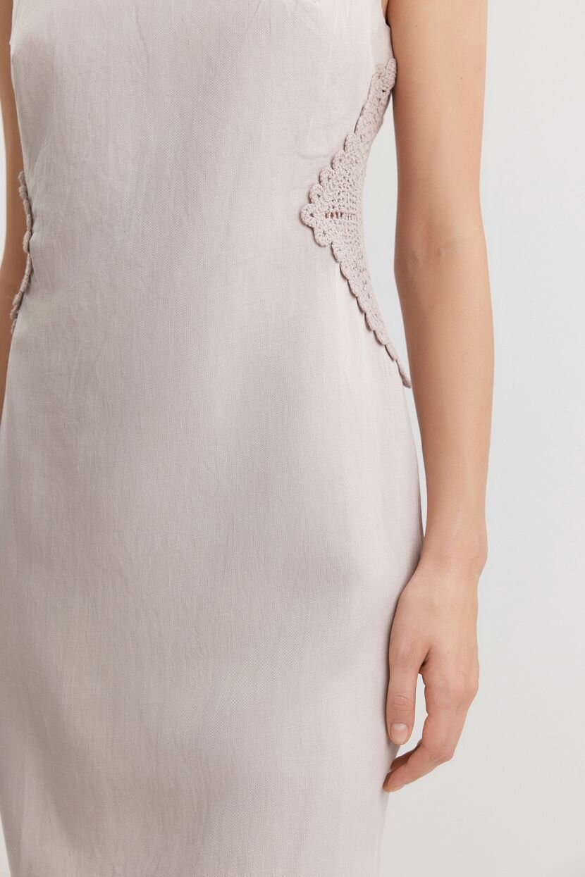 Женское платье-футляр из премиальной смесовой ткани (70% вискоза, 30% лен) с подкладкой из 100% хлопка, что обеспечивает комфорт в носке и дышащие свойства ткани. Идеально подходит для тёплого весенне-летнего сезона. Модель имеет облегающий силуэт и длину миди, подчёркивает женственность и элегантность образа. Дизайн дополнен вставками кроше, треугольным вырезом на спинке и застёжкой на потайную молнию. Платье без рукавов и воротника станет отличным выбором для вечерних изящных аутфитов или повседневных офисных образов при условии правильной стилизации. Рекомендуется ручная стирка при температуре не более 30°C для сохранения качества ткани.