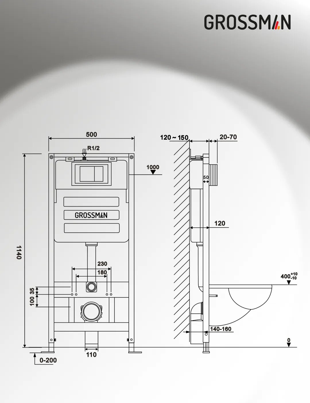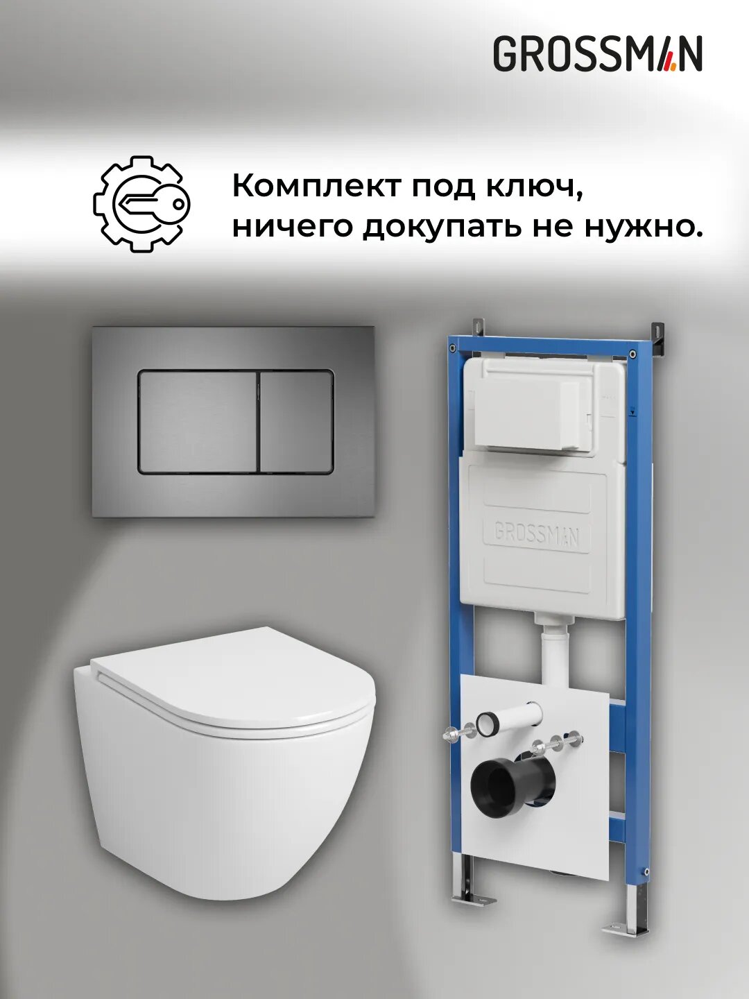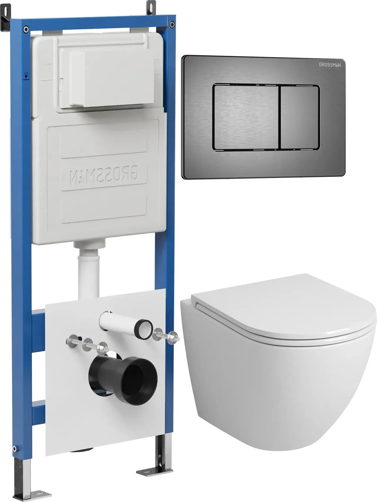 Комплект Унитаз подвесной с инсталляцией Grossman Classic 97.4455SQ.04.42M безободковый, белый+ Кнопка смыва графит сатиновый