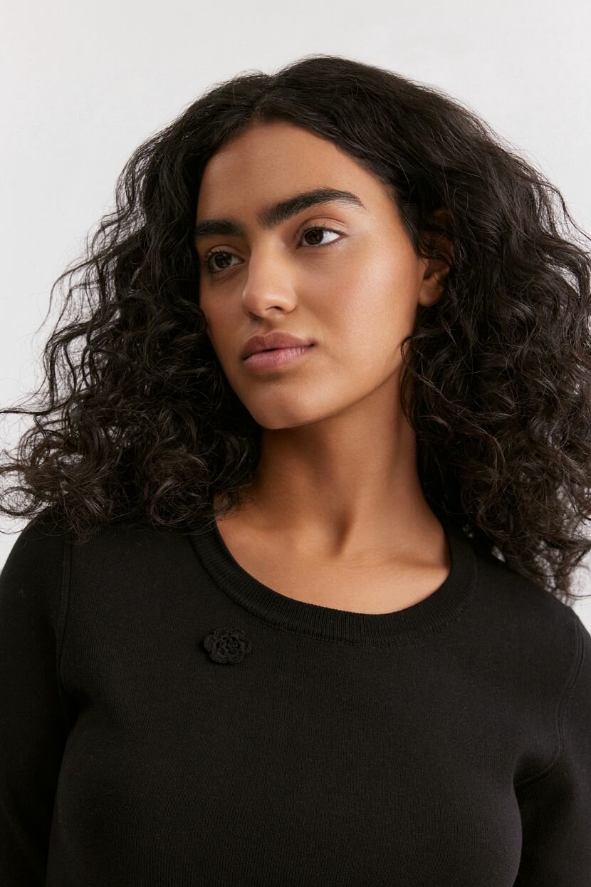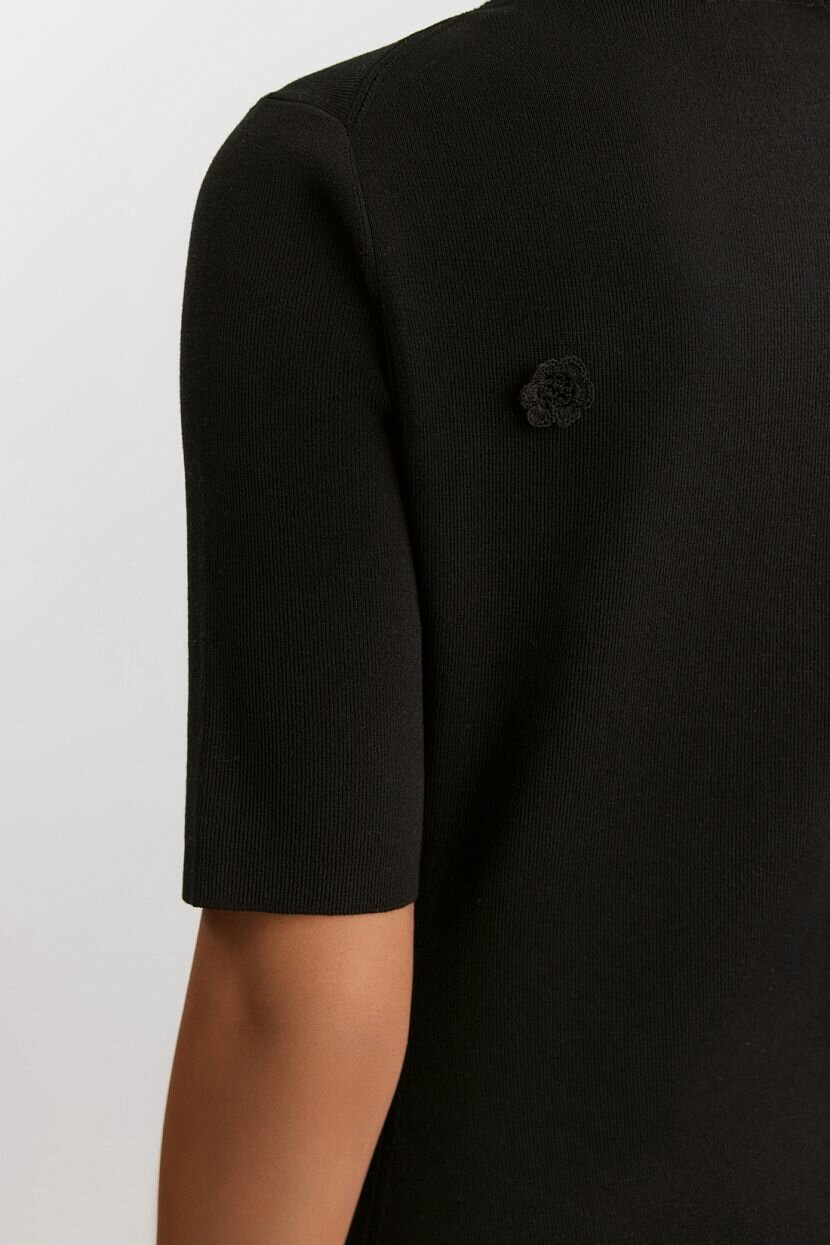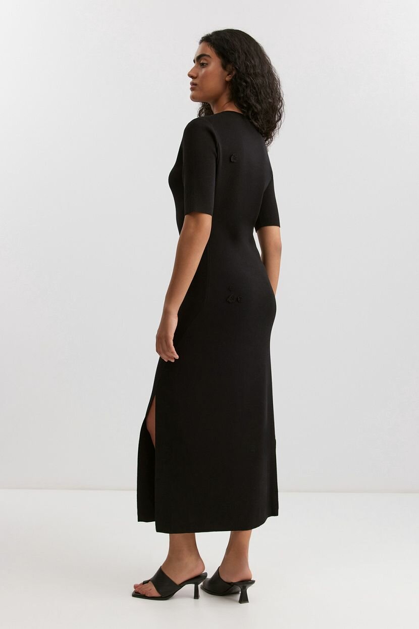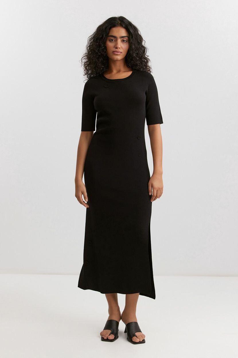Женское платье-футляр из упругой смесовой вискозной пряжи (89% вискоза, 11% полиамид), которая обеспечивает лёгкость, дышащие свойства и комфорт в носке. Модель идеально подходит для летнего и весеннего тёплых сезонов. Платье имеет облегающий силуэт длиной миди и вязаную узорно-рельефную текстуру. Декоративные цветочные аппликации-кроше добавляют изысканность, а разрез в боковом шве — нотку элегантности. Отделка манжет и горловины выполнена в рубчик, подчеркивая аккуратность дизайна. Модель без застёжки и воротника, с аккуратным вырезом, прекрасно вписывается в повседневные образы и подходит для вечерних выходов. Рекомендуется ручная стирка при температуре не более 30°C для сохранения качества изделия.