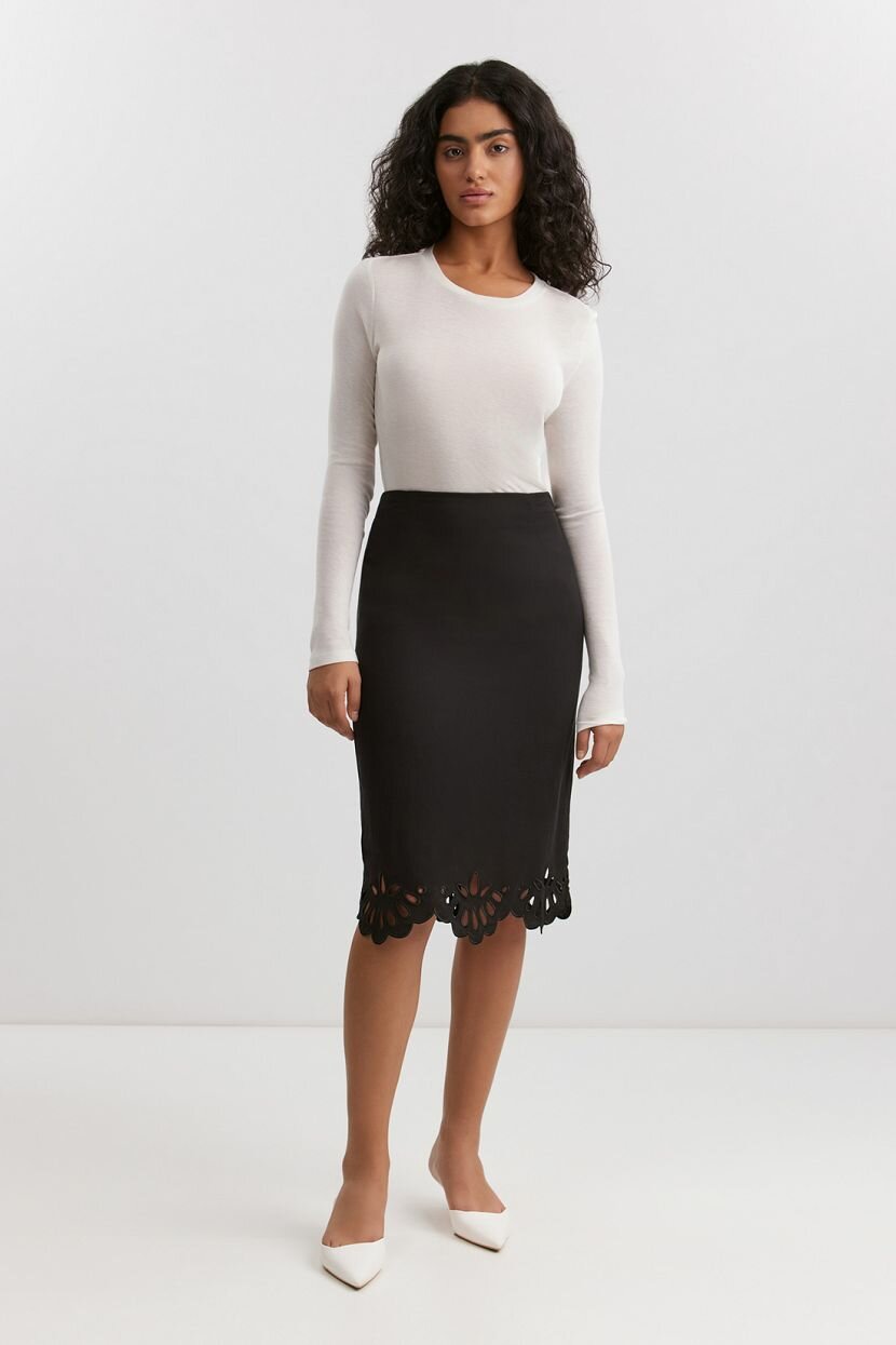 Женская юбка из премиальной ткани (70% вискоза, 30% лен) с хлопковой подкладкой обеспечивает лёгкость и дышащие свойства, что делает её идеальной для летнего и весеннего тёплых сезонов. Модель имеет прямой крой длиной ниже колена. Декоративная объёмная вышивка ришелье с фестонами по краю придаёт утончённый и стильный вид. Разрез в среднем шве добавляет элегантности, а застёжка на потайную молнию обеспечивает удобство. Рекомендуется ручная стирка при температуре не более 30°C для сохранения ткани.
