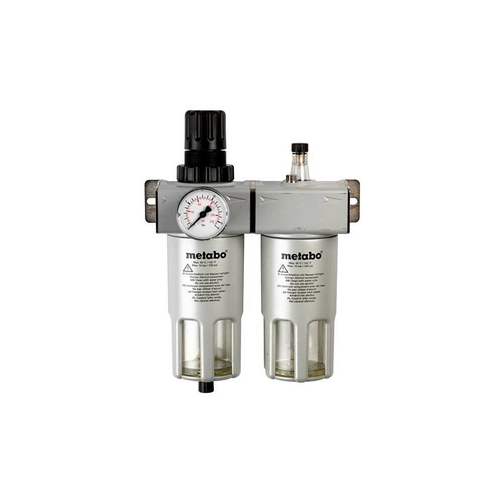 Фильтр FRL-200 Metabo предназначен для очистки сжатого воздуха, поступающего от компрессора, от воды, масла и пыли. Включает в себя фильтр-регулятор FR масленку L. На корпусе имеется скоба для крепления к стене, также есть возможность установки фильтра в распределительный щит или трубопровод. Встроенный манометр позволяет отслеживать уровень давления воздуха, подаваемого к пневмоинтсрументу. Адаптер для подключения к резьбе 3/8" и 1/4" дает возможность использовать его с любыми компрессорами. Производительность - 1500 л/мин. Максимальное давление - 14 бар.