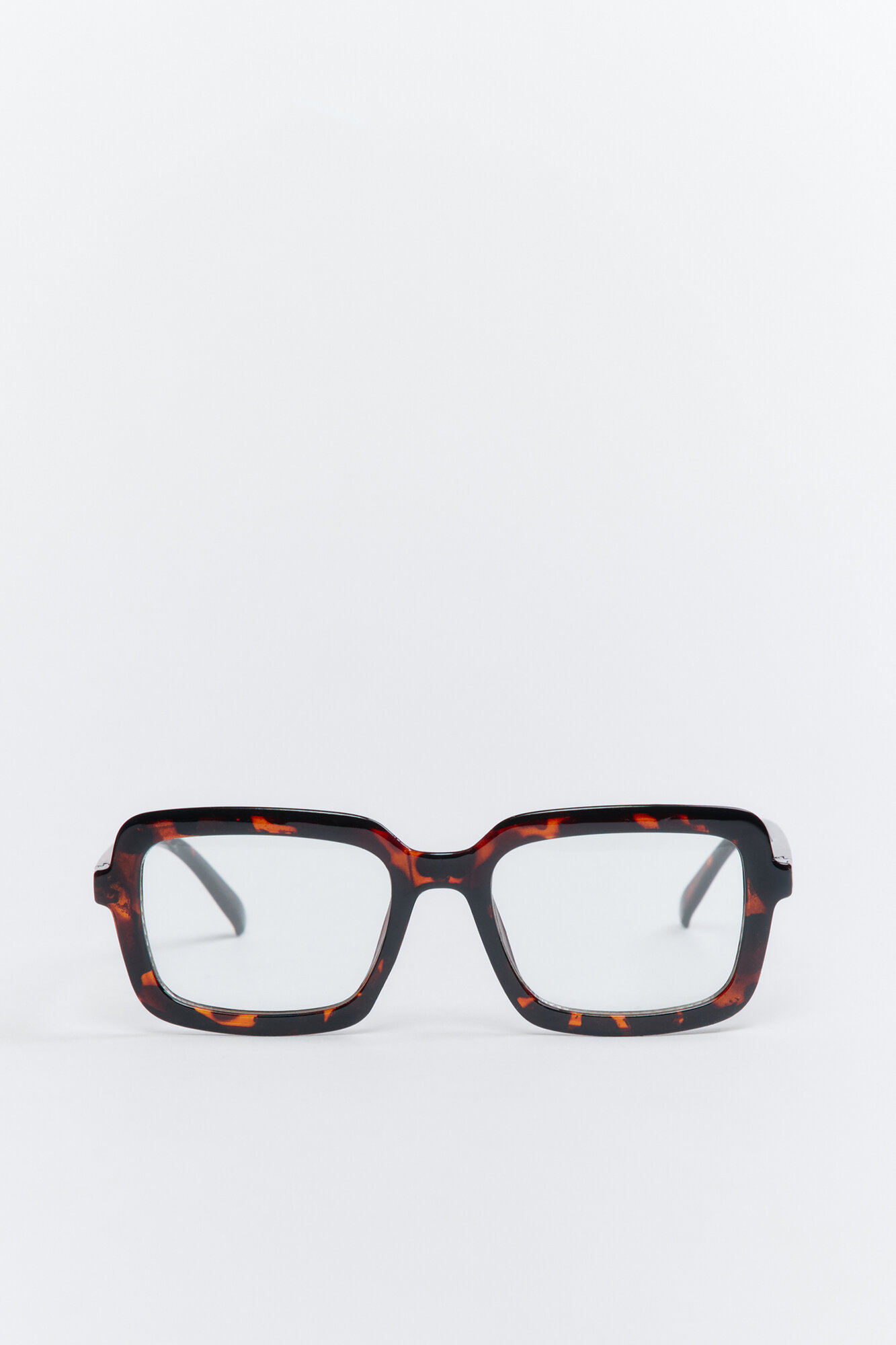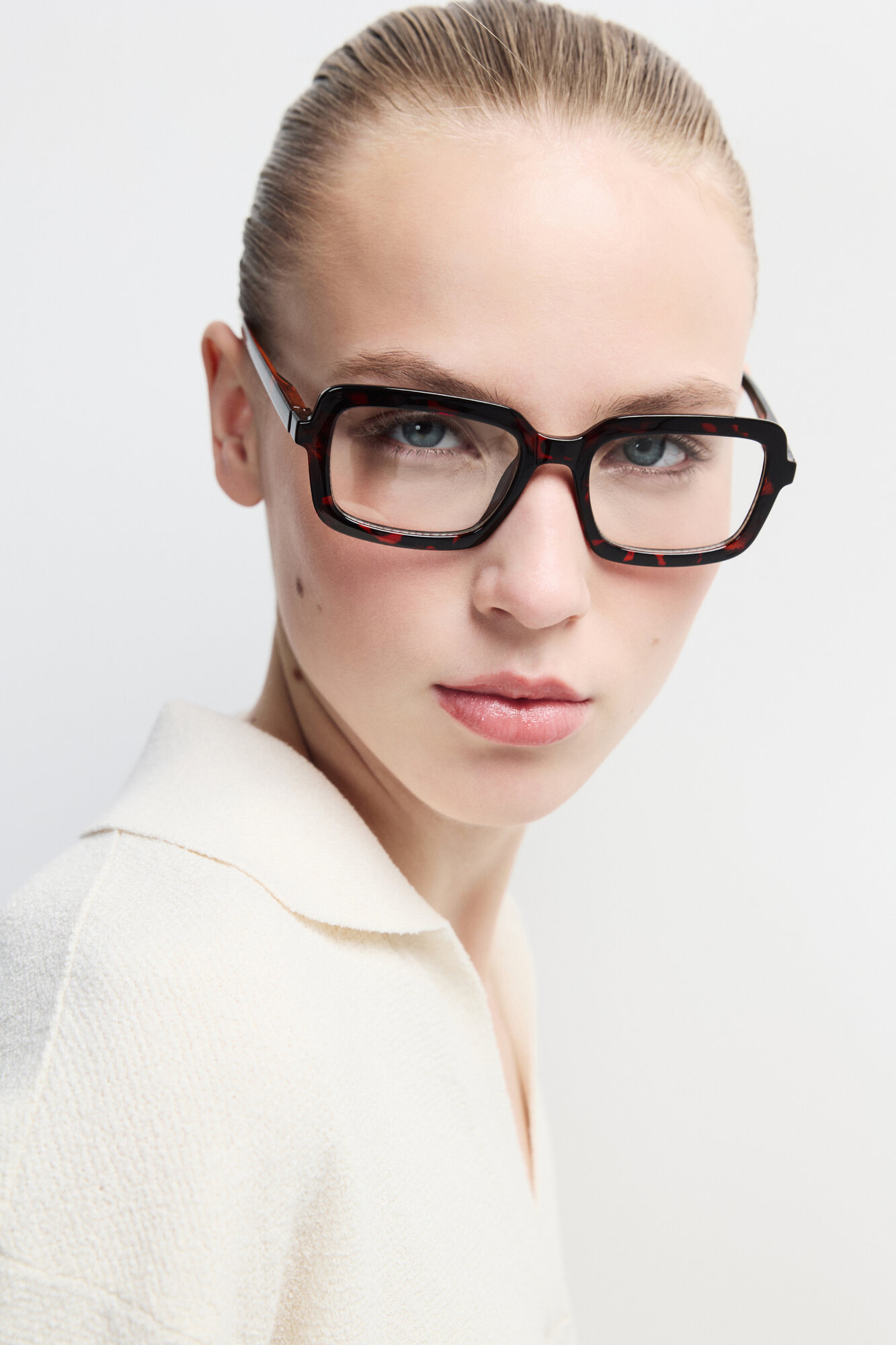 - Узкие заушники, пластиковые носоупоры, прозрачные прямоугольные линзы
