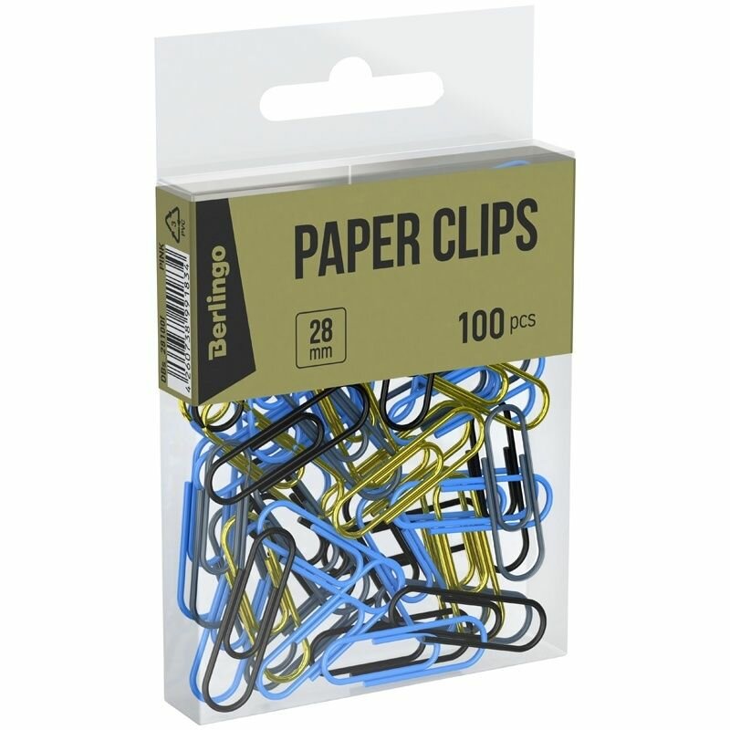 Оригинальные металлические канцелярские скрепки Berlingo с цветным виниловым покрытием. Не ржавеют, не пачкают бумагу, обеспечивают надежное скрепление. Упаковка в ПВХ коробочку - по 100 шт.
