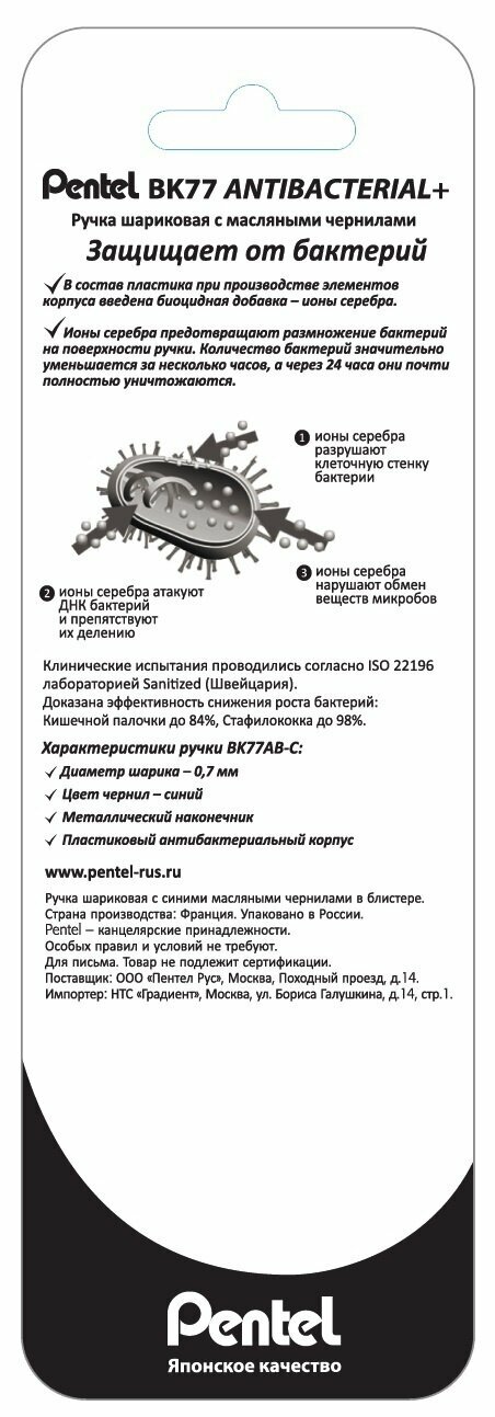 На сегодняшний день товар «Набор ручек шариковые Pentel "Antibacterial"d 07 мм 2 шт металлический наконечник цвет чернил: син (XBK77AB-CC)» можно купить с кешбеком в 1 магазине: Арт-маркет "Красный Карандаш"