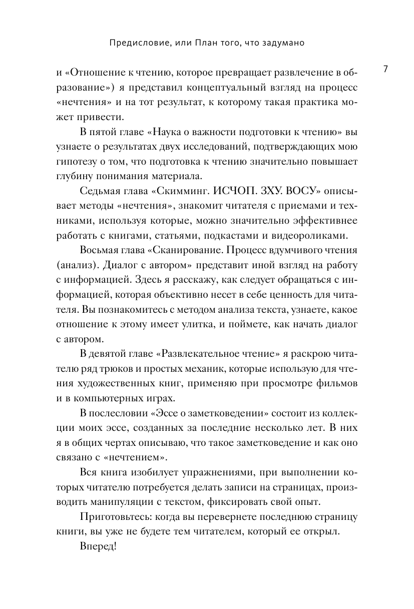 Рустам Агамалиев предлагает авторскую концепцию нечтения. Его система позволяет не только быстро извлекать ключевую информацию из текста, но и оптимизировать процесс поиска и использования источников, чтобы максимально упростить и ускорить работу с текстами.