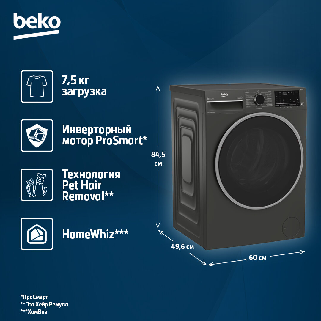 | Стирка | 7.5 кг, 1200 об/мин |