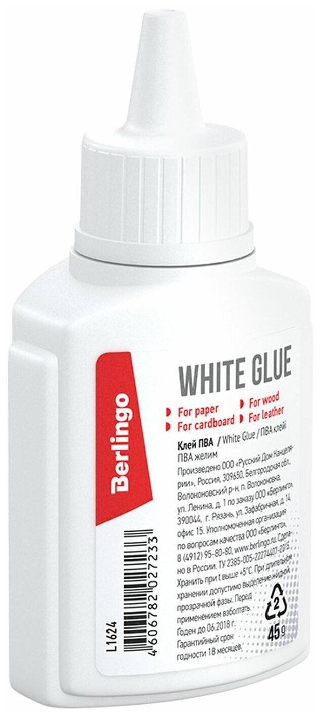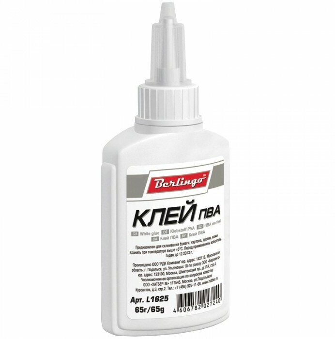 Клей ПВА Berlingo предназначен для склеивания бумаги, картона, дерева, стекла, кожи, ткани. Вес - 45 граммов. В термоусадке по 10 штук. Клей морозостойкий. Выдерживает 5 циклов заморозки/разморозки при температуре до -40°С, сохраняя при этом однородность текстуры и потребительские свойства. Упаковка не деформируется при низких температурах. Хранить при температуре свыше +5°С. Удобный флакон с дозатором, который обеспечивает экономичный расход клея. Не содержит растворителя. Не оставляет следов и легко смывается водой.
