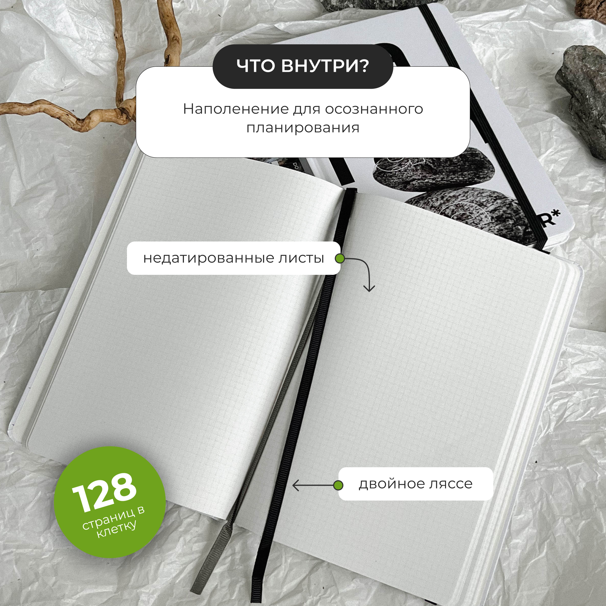 Только пустые страницы для простора творчества. Ничто не отвлечет вас от главного — идей, мыслей или зарисовок. Серая, едва заметная линовка позволяет использовать планер для записи конспектов, планирования по системе Bullet Journal, ведения личного дневника или дневника благодарностей, рисования и любых других идей. Будьте собой и творите, выходя за рамки!