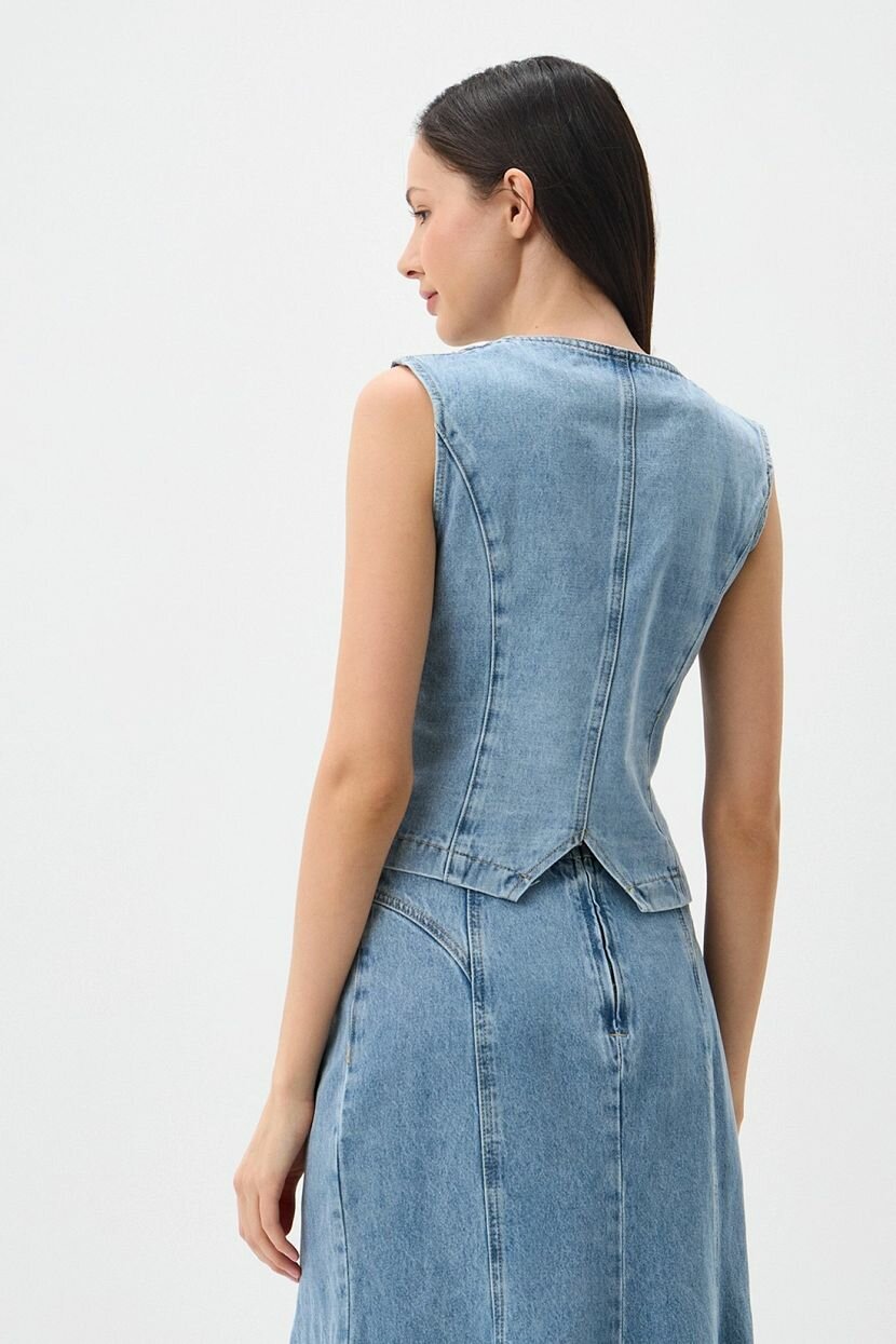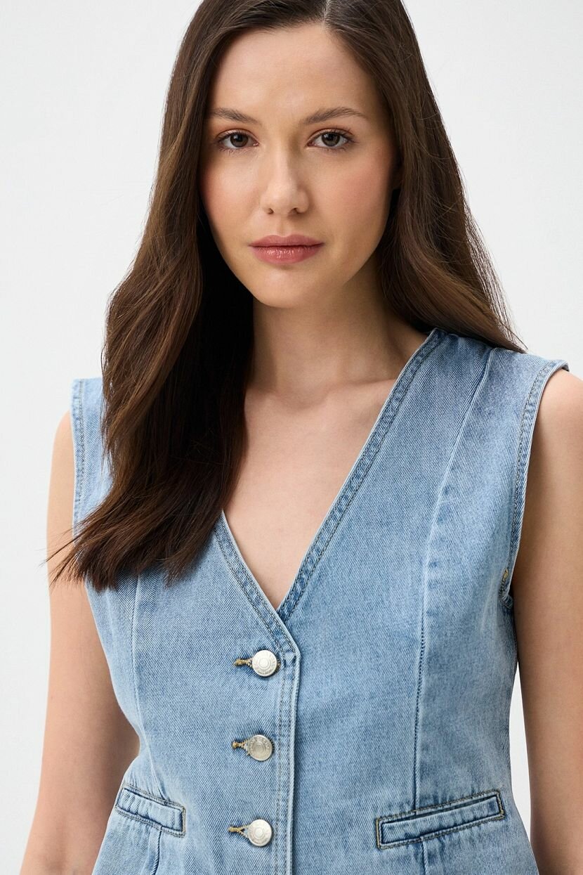 Женский жилет полуприлегающего кроя из хлопка (84%), вискозы (8%) и полиэстера (8%), обеспечивает превосходный комфорт и легкость в каждом образе. Классический однобортный крой с V-образным вырезом, застежка на пуговицы. Джинсовая ткань плотной структуры имеет легкий винтажный эффект. Оснащен брендированной фурнитурой. Органично стилизуется как в повседневных кэжуал, так и в деловых офисных аутфитах с нестрогим дресс-кодом. Доступен в больших размерах. Рекомендуется бережная стирка при 30°C для сохранения качества ткани.