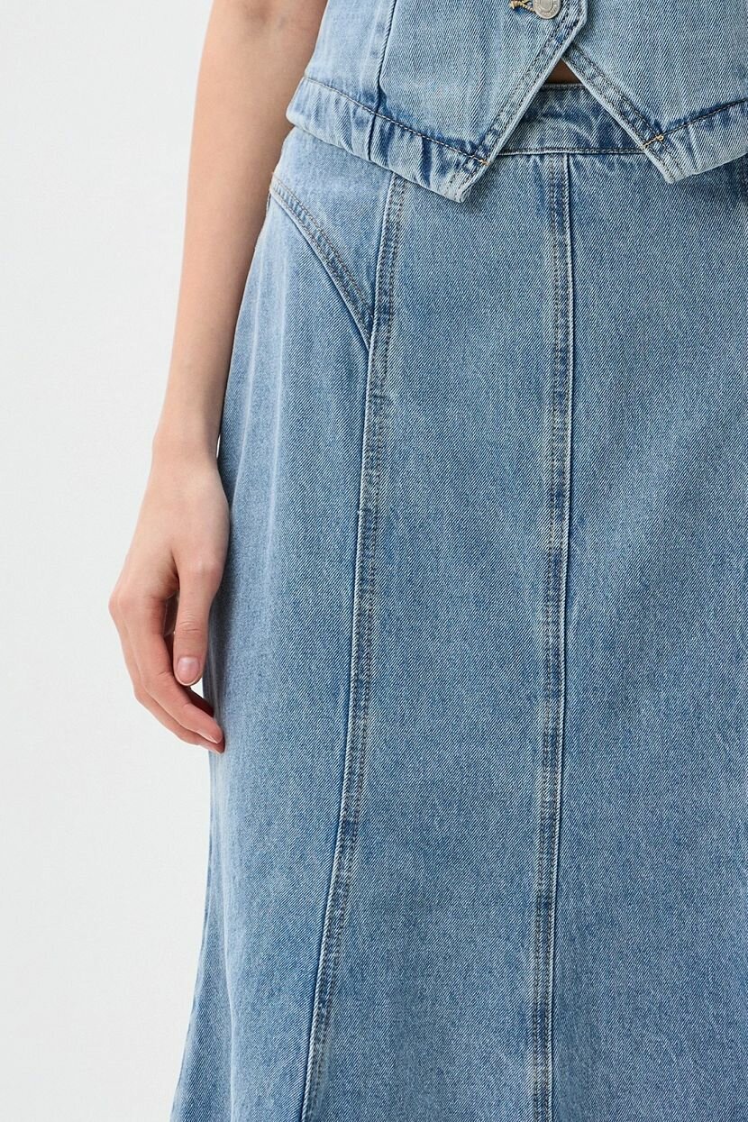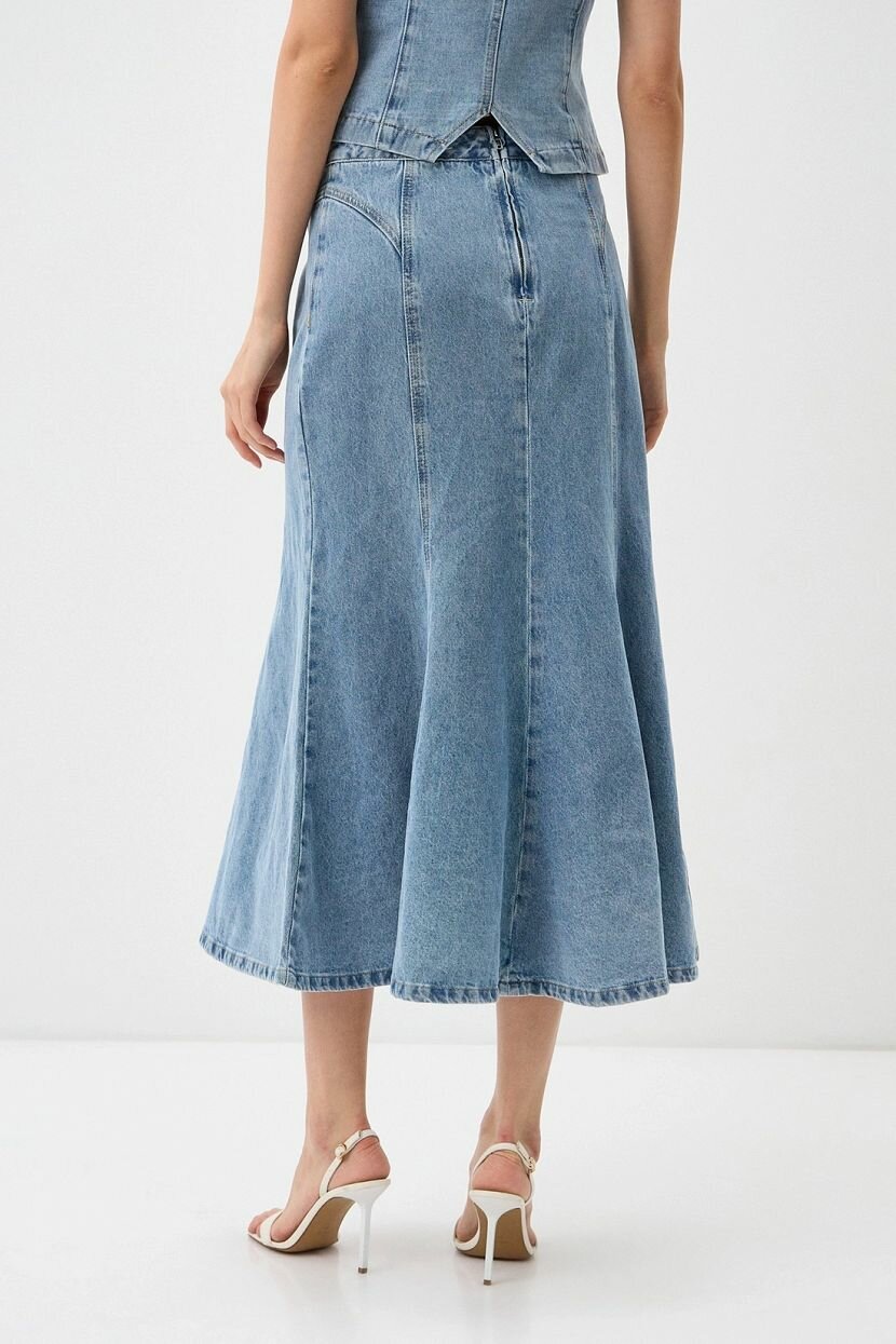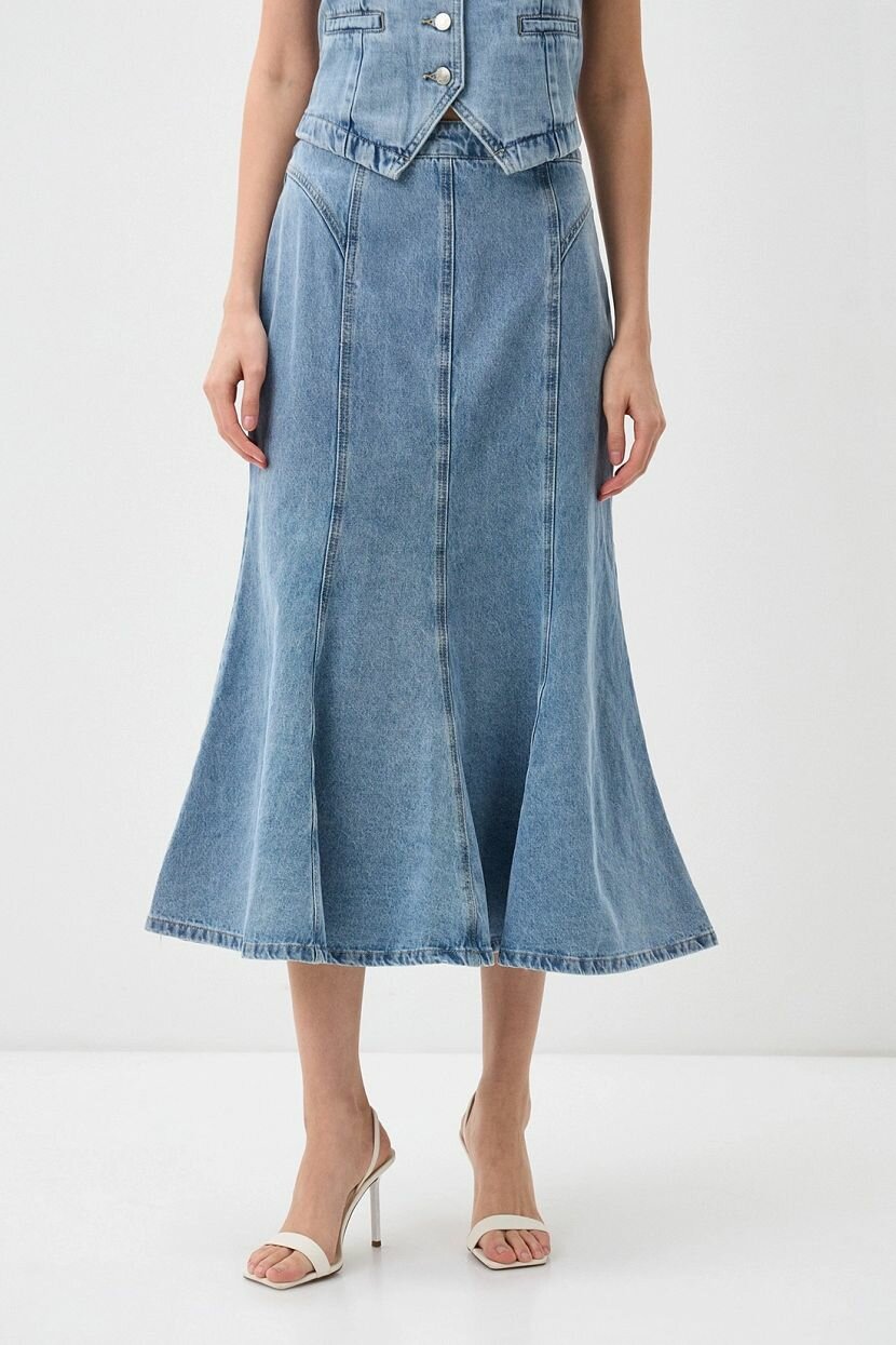 Женская юбка длины миди из смесового хлопкового денима с добавлением вискозы и полиэстера (84% хлопка, 8% вискозы и 8% полиэстера). Дышащий материал с включением натуральных волокон обеспечивает комфорт и свободу движений. Модель полуприлегающего кроя со средней посадкой имеет застежку на молнию и брендированную фурнитуру. Деним в голубом окрасе с легким винтажным эффектом. Джинсовая юбка длиной ниже колена не предусматривает подкладку. Доступна в больших размерах. Рекомендуется бережная стирка при температуре не более 30°C для сохранения качества ткани.
