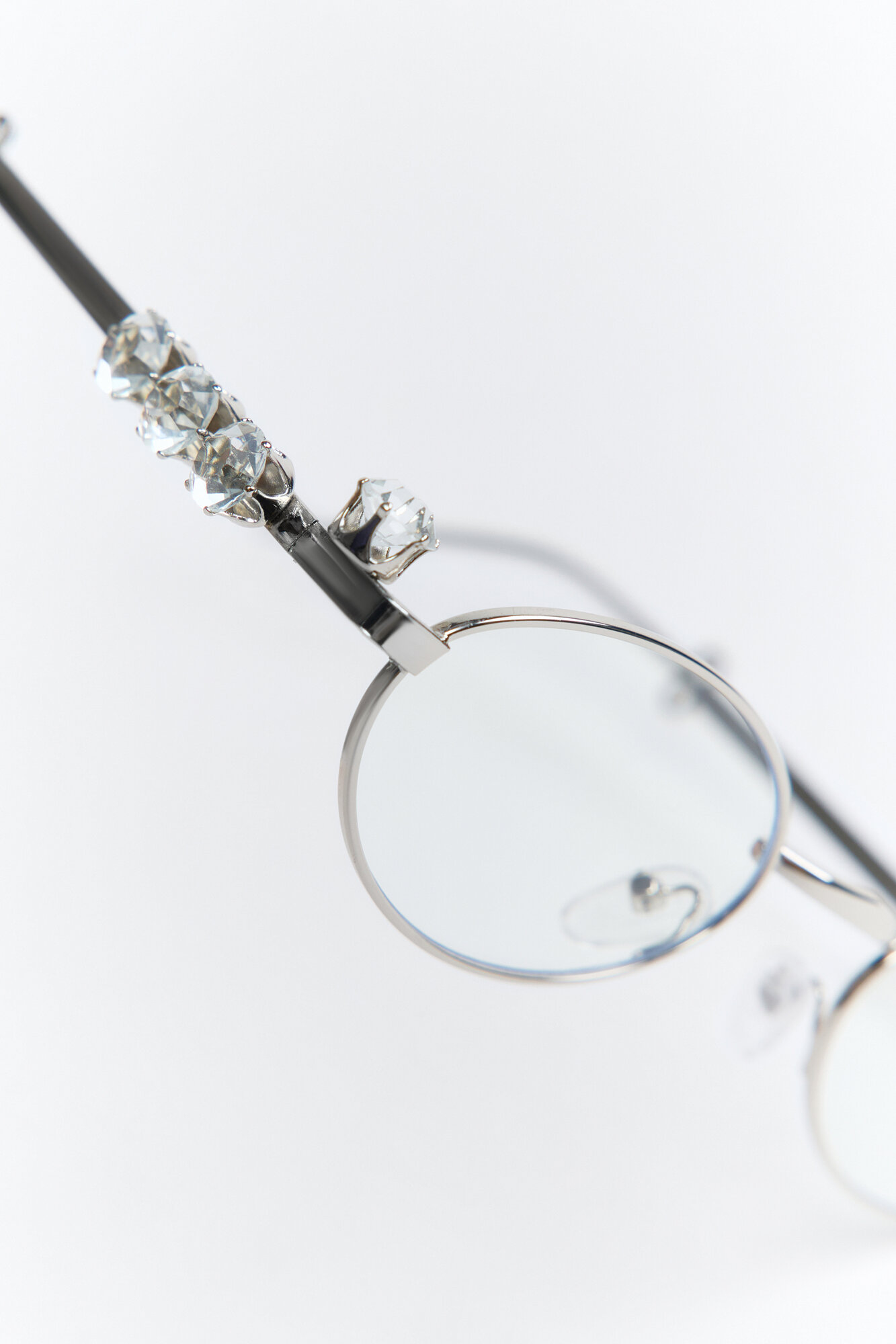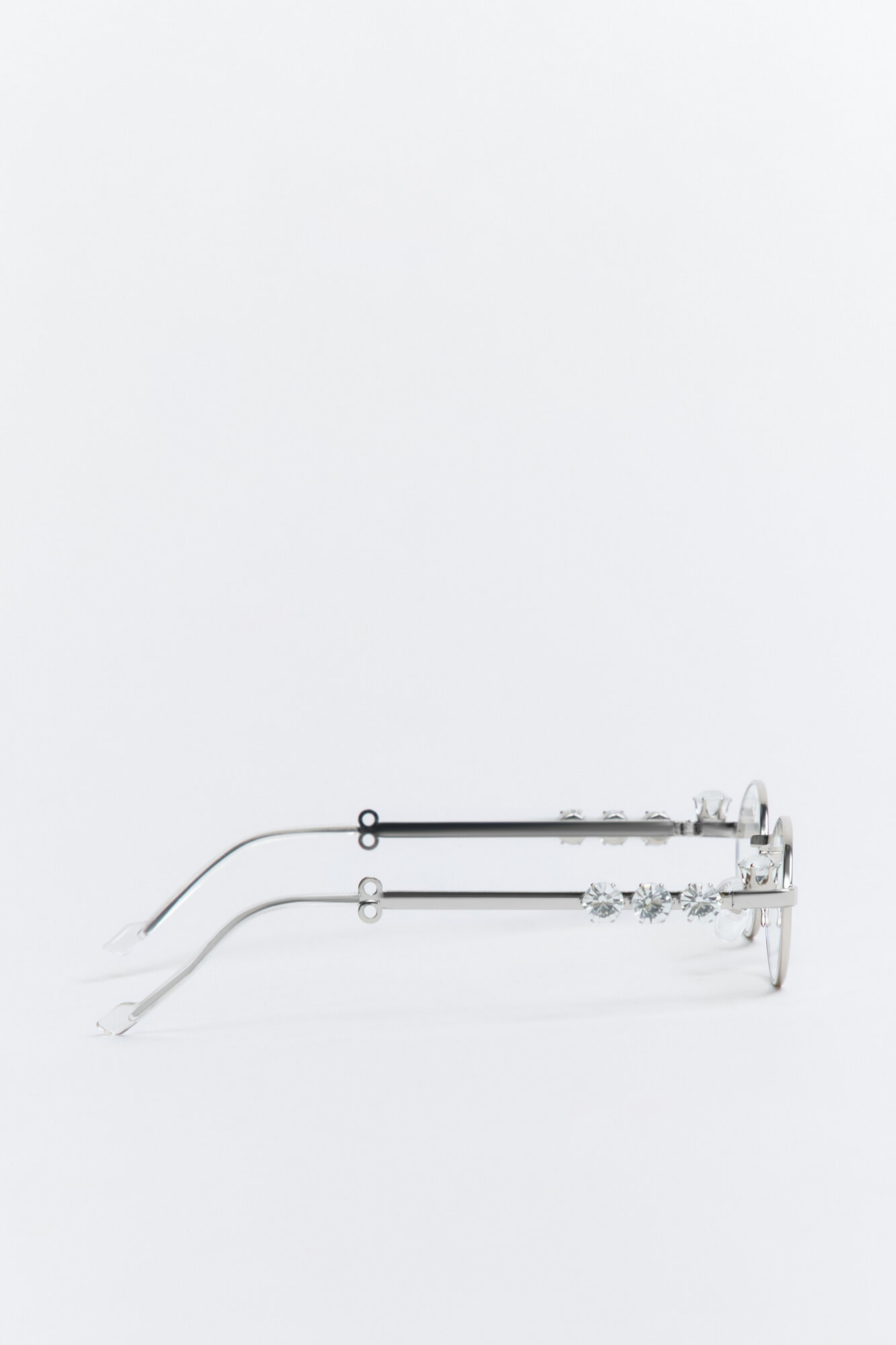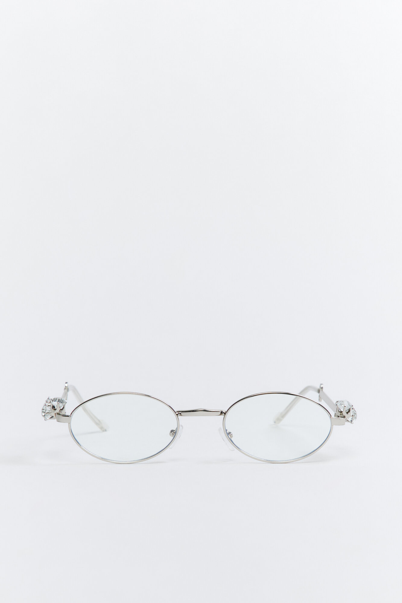 - Тонкие заушники, силиконовые носоупоры, прозрачные овальные линзы, декоративные стразы на дужках