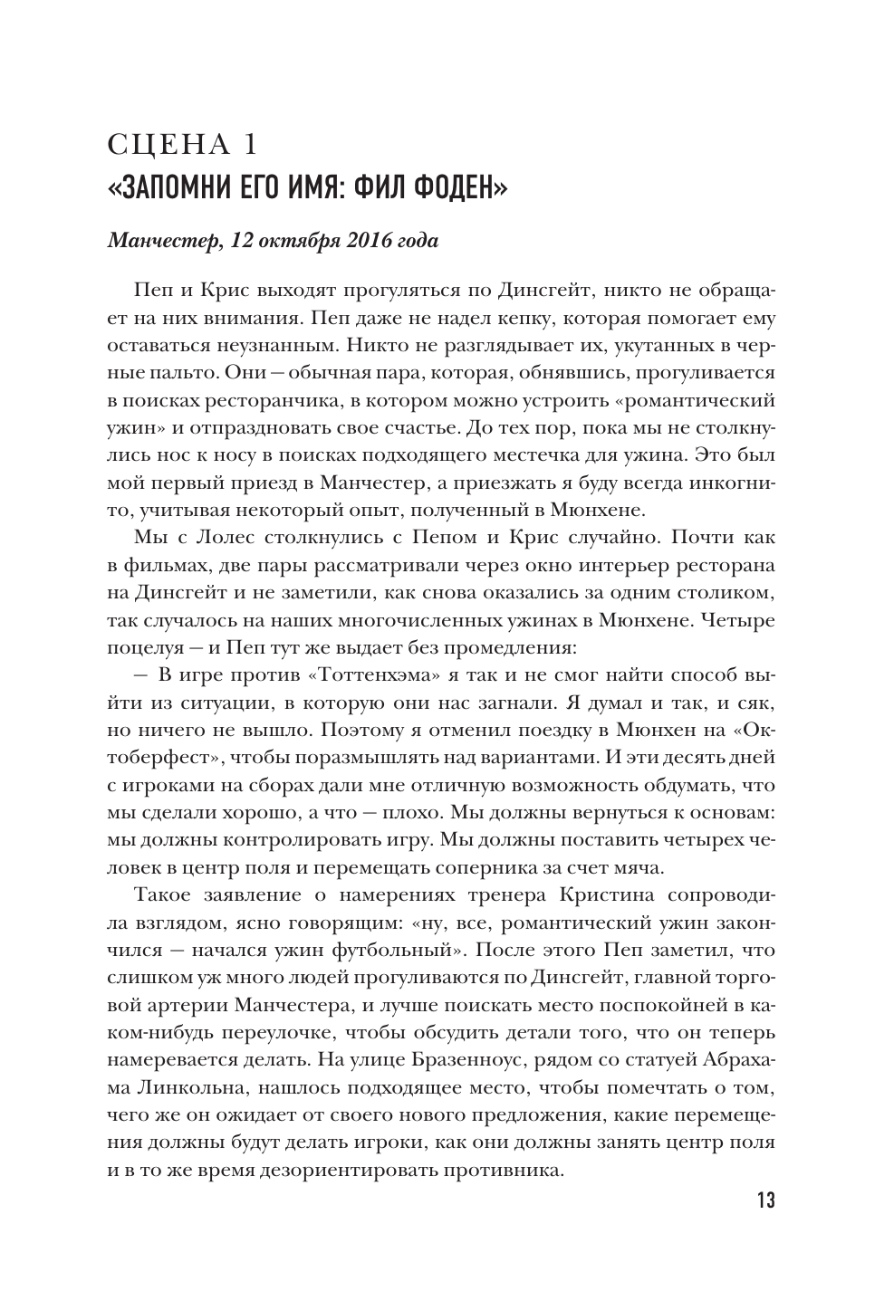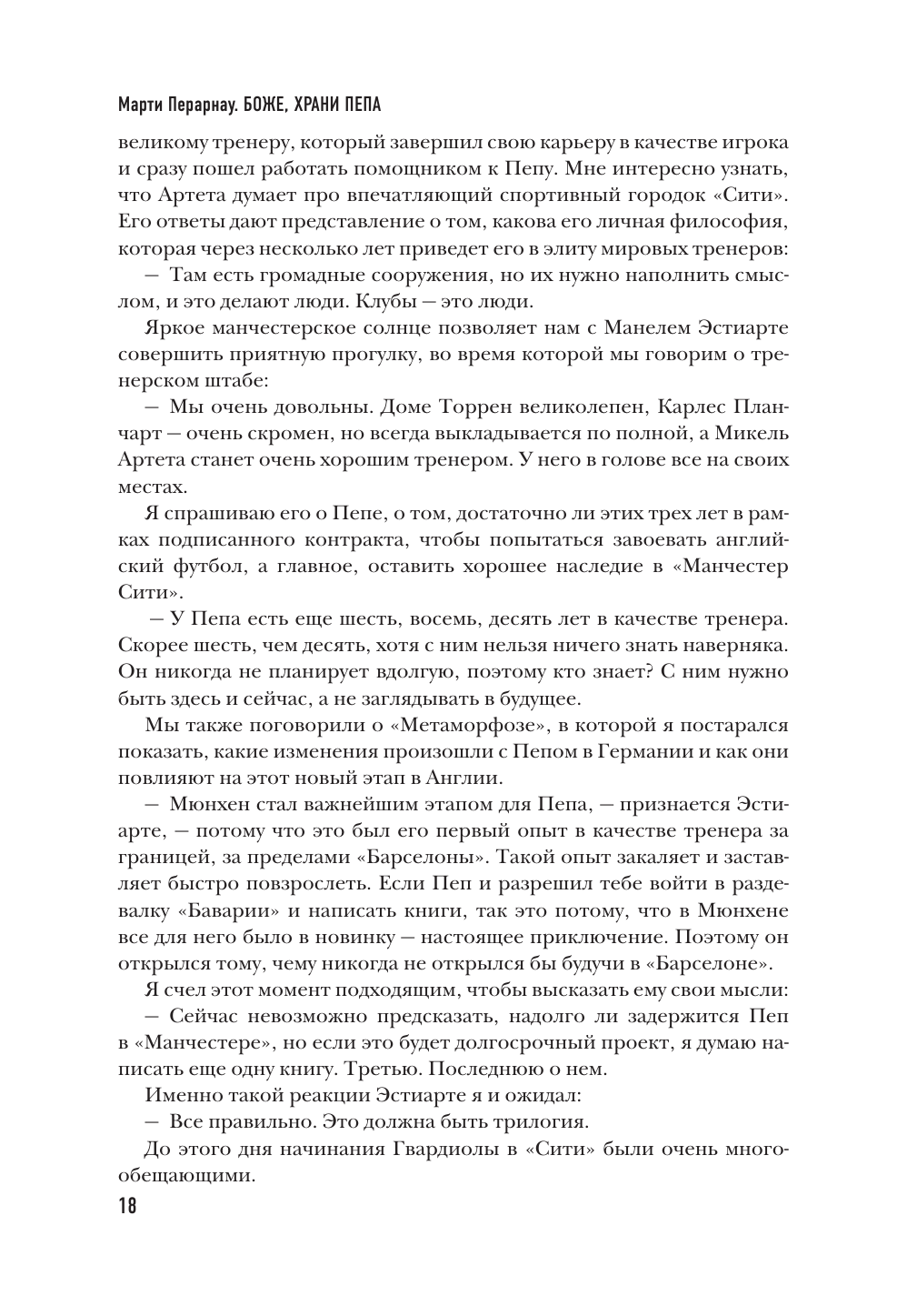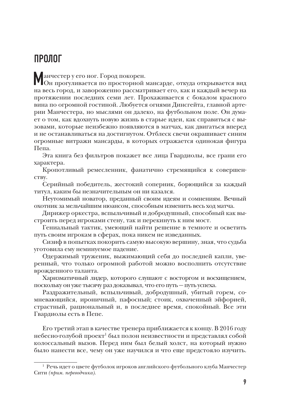 - Триумфы, поражения, страхи, сомнения, эйфория победы. Книга написана человеком, приближенным к Гвардиоле и тонко прочувствовавшим все, что случилось с ним за эти годы. Эта книга — удивительный путь Пепа, на котором читатель повстречает тысячи людей.