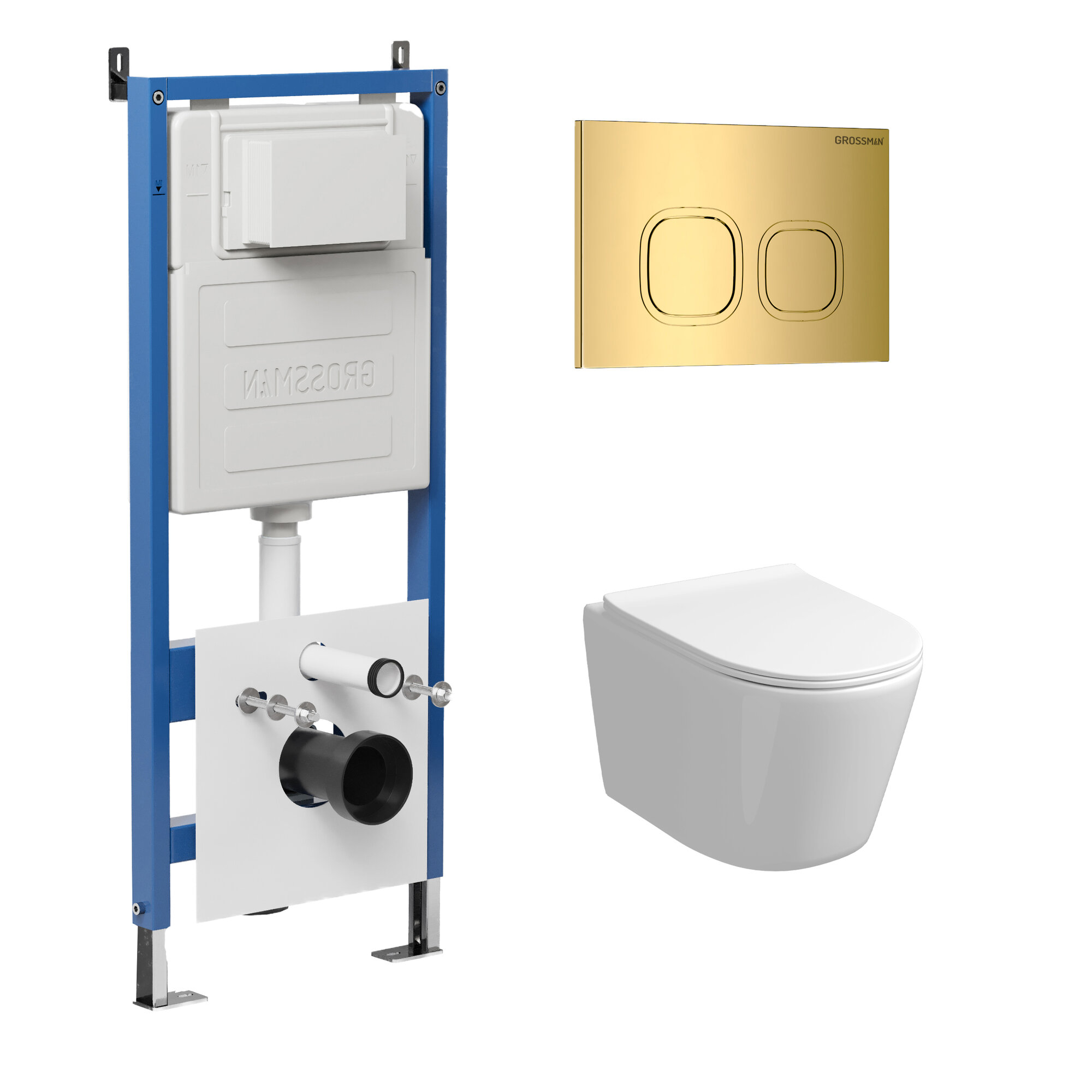 Комплект Унитаз подвесной с инсталляцией Grossman Cosmo 97.4477S.02.300 безободковый, белый+ Кнопка смыва золото глянцевое
