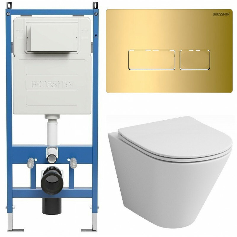 Комплект Унитаз подвесной с инсталляцией Grossman Pragma 97.4477S.03.300 безободковый, белый+ Кнопка смыва золото глянцевое