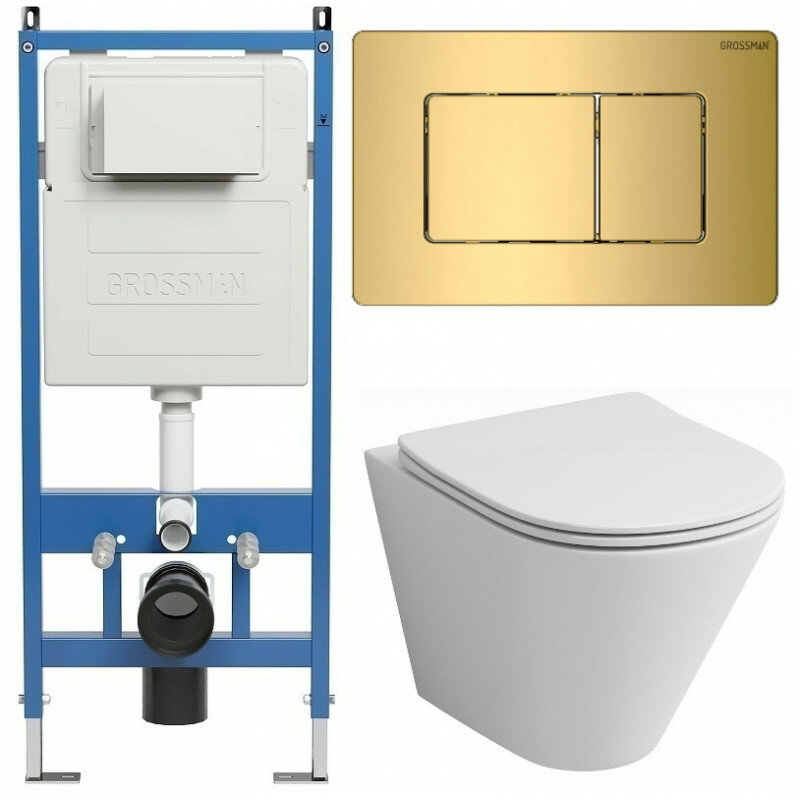 Комплект Унитаз подвесной с инсталляцией Grossman Classic 97.4477S.04.30M безободковый, белый+ Кнопка смыва золото глянцевое