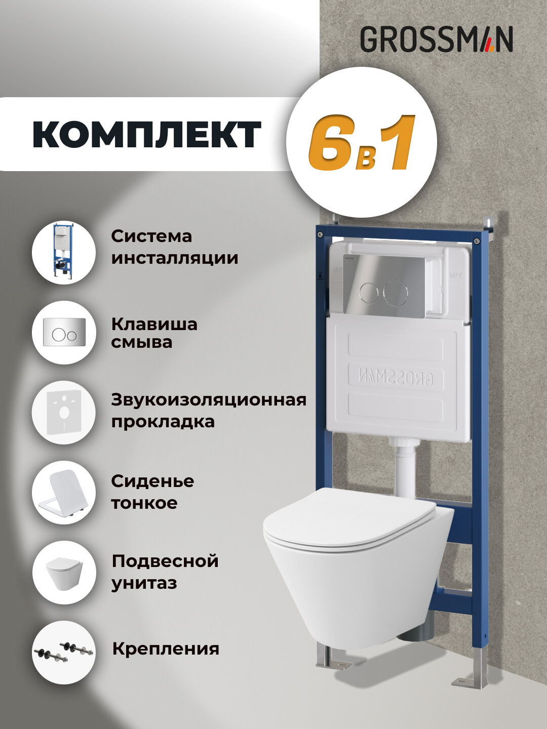 Комплект Унитаз подвесной с инсталляцией Grossman Style 97.4477S.05.10M безободковый, белый+ Кнопка смыва хром глянцевый