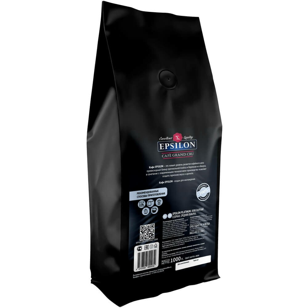 Кофе в зернах EPSILON Platinum, 1 кг, 100% АрабикаНасладитесь богатым вкусом и ароматом премиального кофе EPSILON Platinum, созданного для настоящих ценителей зернового кофе.Состав: 100% Арабика (Arabica) – отборные зерна из Бразилии и Эфиопии.Производство: Обжарка и упаковка в России по авторской технологии, сохраняющей свежесть и насыщенность.Вкус и аромат: Идеальный баланс для приготовления крепкого эспрессо или мягкого американо.Обжарка: Средняя – раскрывает утонченные нотки и глубокий аромат.Вес: 1 кг – удобная упаковка для дома, офиса или кафе.Кофе EPSILON Platinum станет отличным выбором для ежедневного наслаждения или подарка, наполняя день энергией и вдохновением.