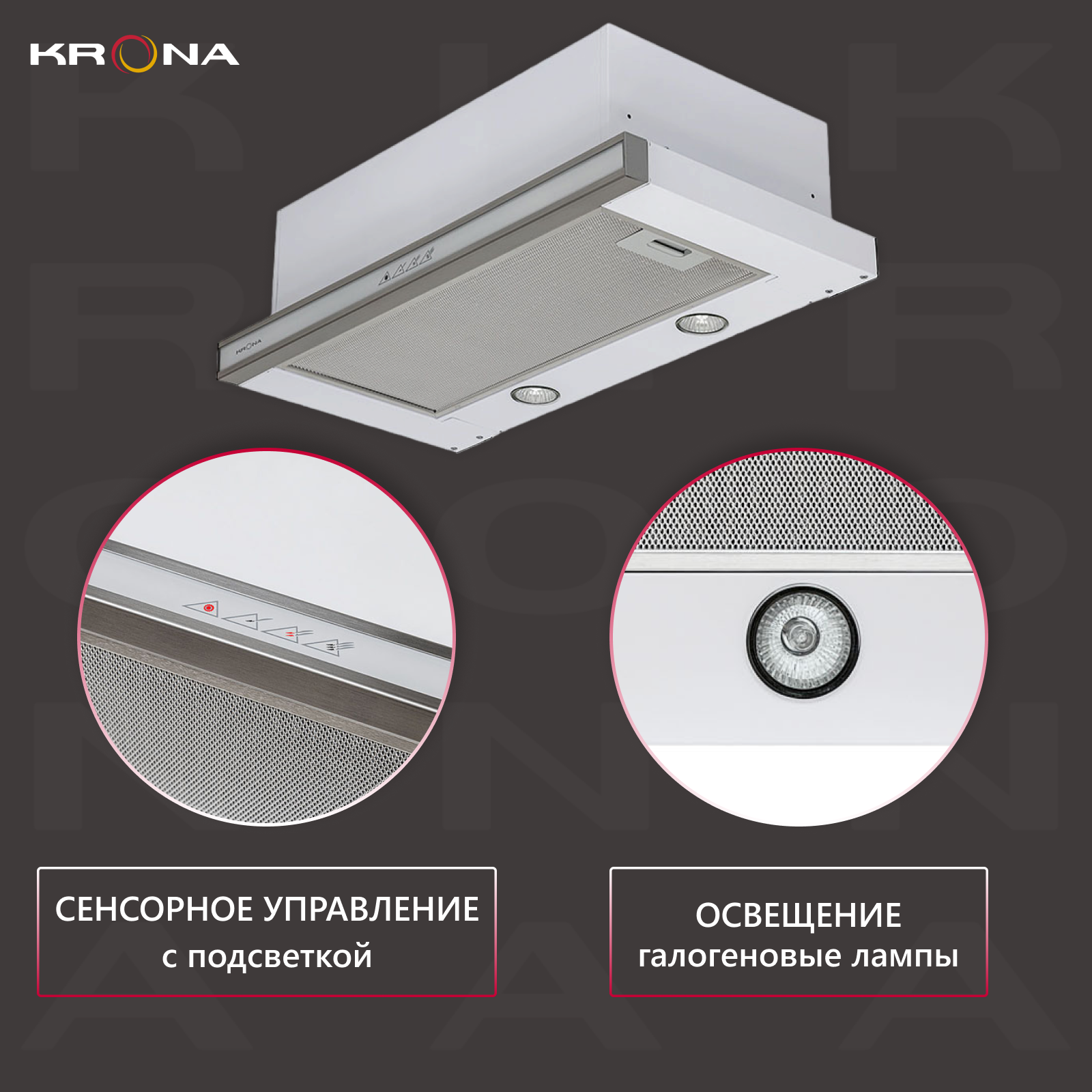 Встраиваемая вытяжка в шкаф бренда KRONA, серии Kamilla sensor 600 white glass (2 мотора), является бестселлером среди всей встраиваемой очистительной техники этого производителя. Двухмоторный прибор работает настолько тихо, что не будет вас отвлекать при приготовлении блюд и даже, когда вы ее включите просто для очищения воздуха на кухне. Фильтрация воздуха может происходить в режиме рециркуляции. На угольном фильтре будут задерживаться жировые частицы.