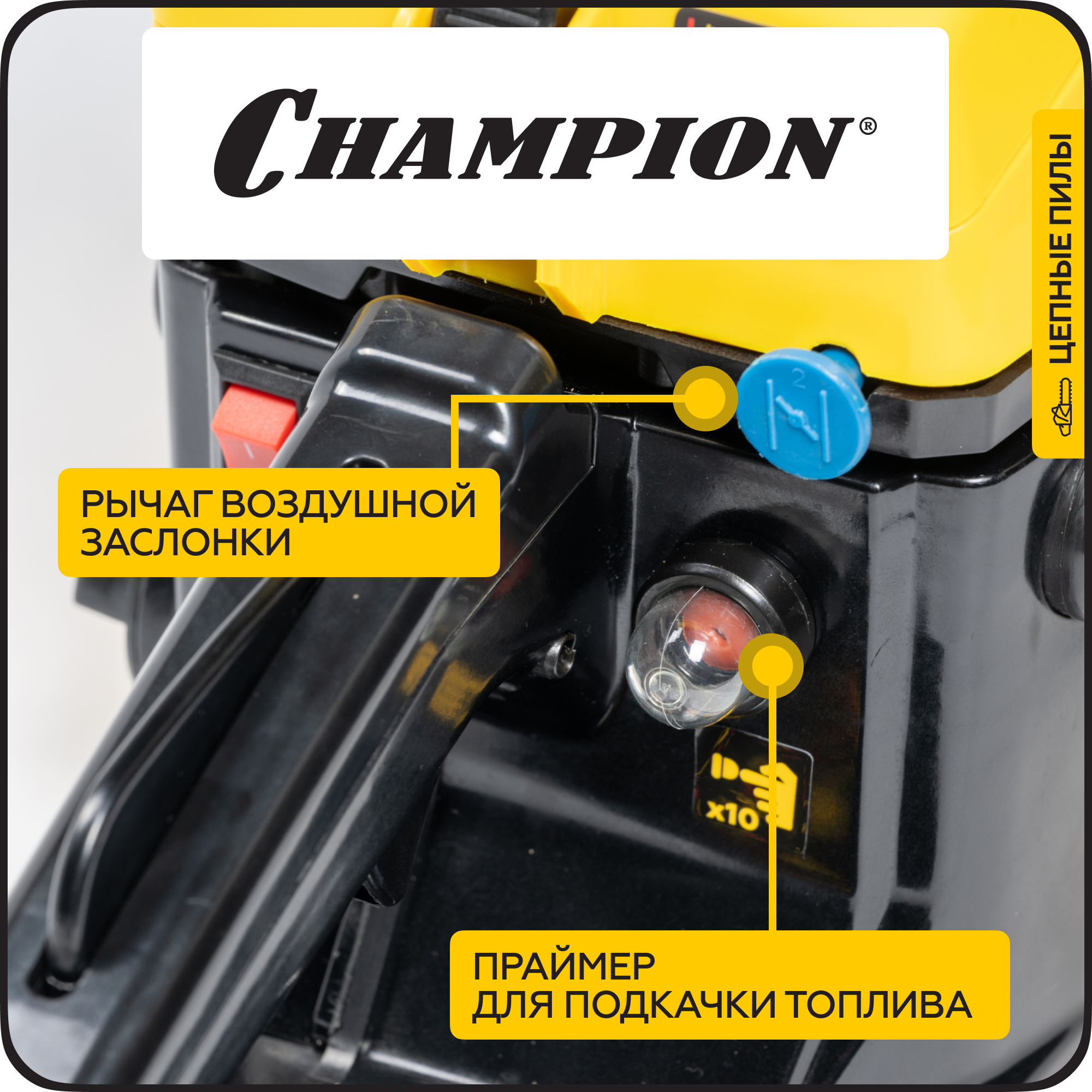 Бензопила Champion 256-15 — это надёжная полупрофессиональная модель для выполнения различных задач по распиловке древесины.Преимущества Зубчатый упор обеспечивает надёжную фиксацию пилы во время работы, повышая точность реза Праймер облегчает запуск двигателя даже в холодное время года Система лёгкого старта с дополнительной пружиной минимизирует усилия при запуске Режим «зима-лето» гарантирует стабильную работу даже при низких температурах Регулируемый маслонасос обеспечивает экономичный расход масла